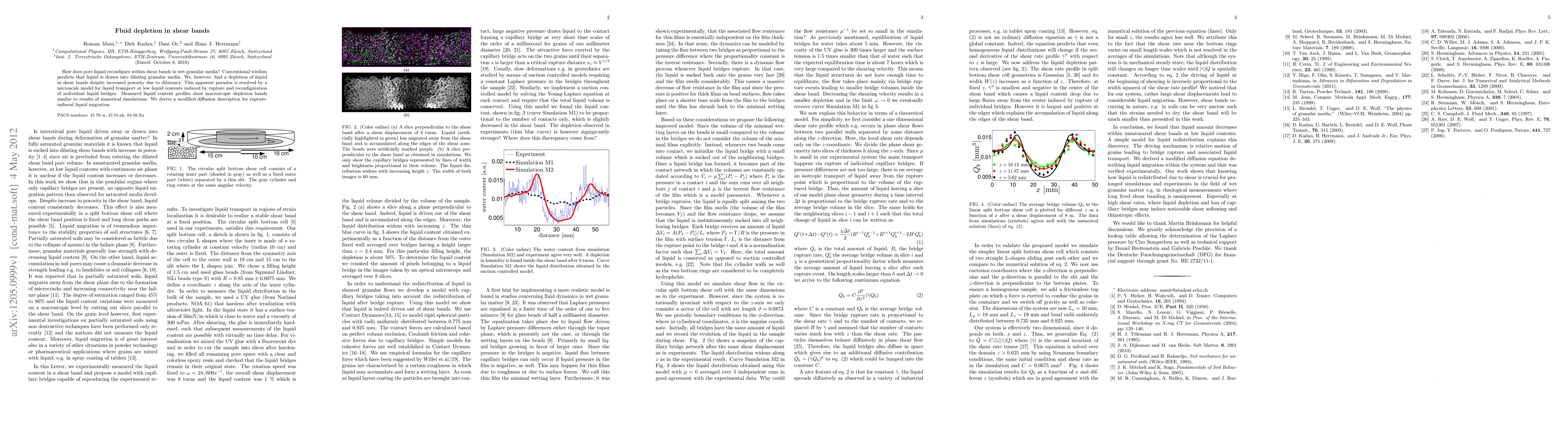 This study reveals that liquid is depleted in shear bands within wet granular media despite increased porosity from dilatancy, resolved by a microscale model of liquid bridge rupture and reconfiguration. Numerical simulations and measurements show macroscopic depletion bands, leading to a modified diffusion description for rupture-induced liquid migration.