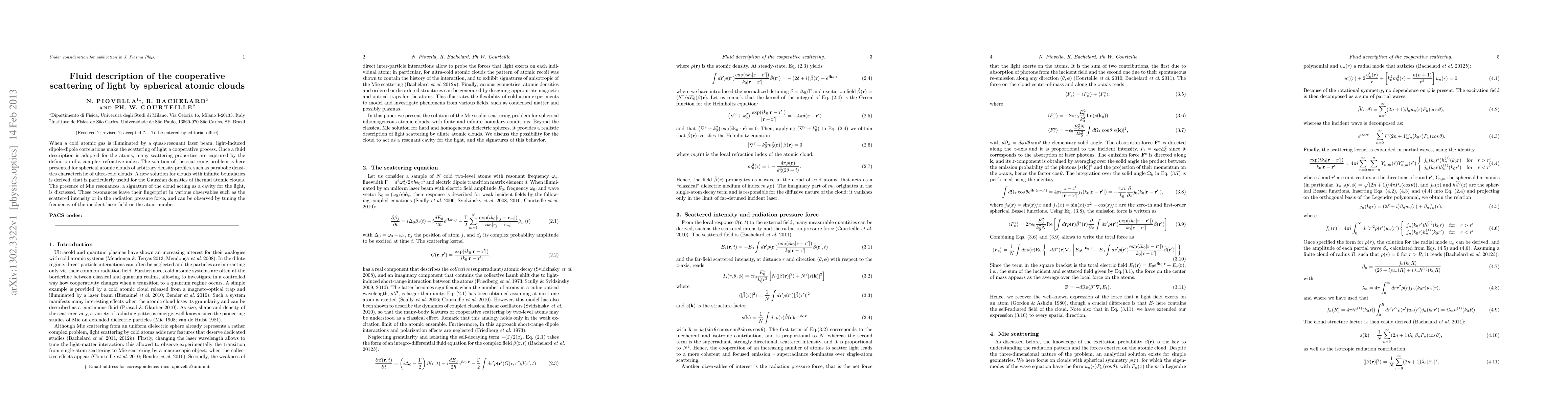 This paper presents a fluid description for the cooperative scattering of light by spherical atomic clouds, revealing how light-induced dipole-dipole correlations lead to Mie resonances. The study derives solutions for scattering properties using a complex refractive index, applicable to various density profiles, including parabolic and Gaussian distributions.