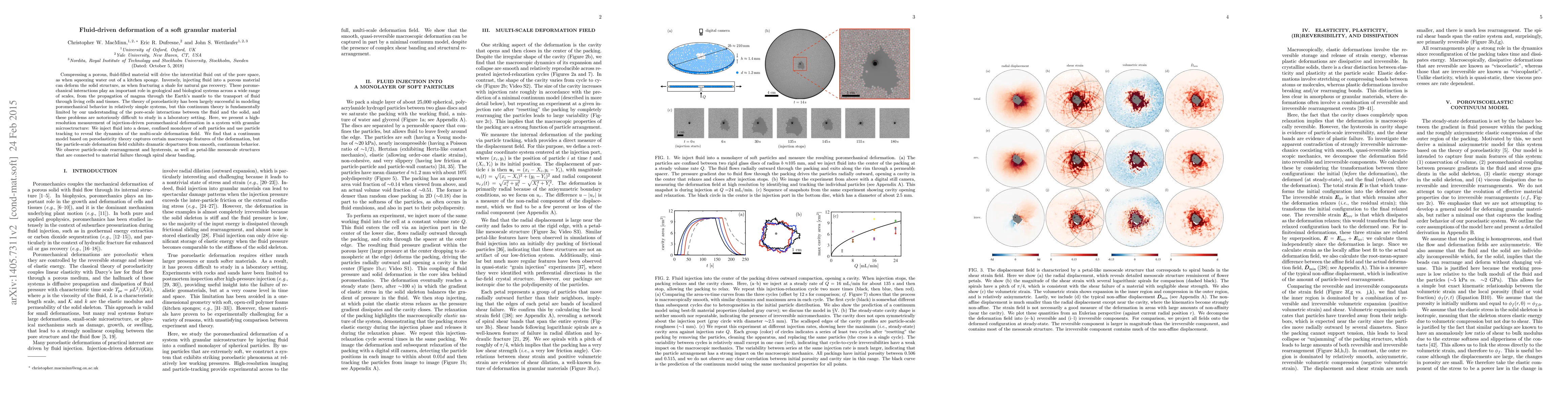 Compressing a porous, fluid-filled material will drive the interstitial fluid out of the pore space, as when squeezing water out of a kitchen sponge. Inversely, injecting fluid into a porous material can deform the solid structure, as when fracturing a shale for natural gas recovery. These poromechanical interactions play an important role in geological and biological systems across a wide range of scales, from the propagation of magma through the Earth's mantle to the transport of fluid through living cells and tissues. The theory of poroelasticity has been largely successful in modeling poromechanical behavior in relatively simple systems, but this continuum theory is fundamentally limited by our understanding of the pore-scale interactions between the fluid and the solid, and these problems are notoriously difficult to study in a laboratory setting. Here, we present a high-resolution measurement of injection-driven poromechanical deformation in a system with granular microsctructure: We inject fluid into a dense, confined monolayer of soft particles and use particle tracking to reveal the dynamics of the multi-scale deformation field. We find that a continuum model based on poroelasticity theory captures certain macroscopic features of the deformation, but the particle-scale deformation field exhibits dramatic departures from smooth, continuum behavior. We observe particle-scale rearrangement and hysteresis, as well as petal-like mesoscale structures that are connected to material failure through spiral shear banding.
