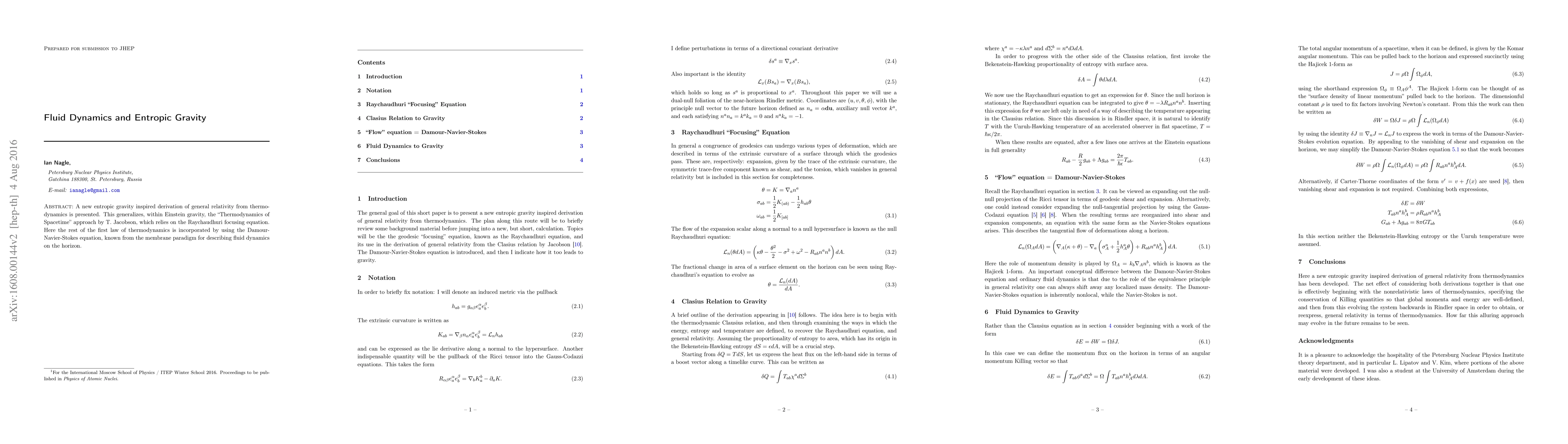 A new entropic gravity inspired derivation of general relativity from thermodynamics is presented. This generalizes, within Einstein gravity, the "Thermodynamics of Spacetime" approach by T. Jacobson, which relies on the Raychaudhuri evolution equation. Here the rest of the first law of thermodynamics is incorporated by using the Damour-Navier-Stokes equation, known from the membrane paradigm for describing fluid dynamics on the horizon.