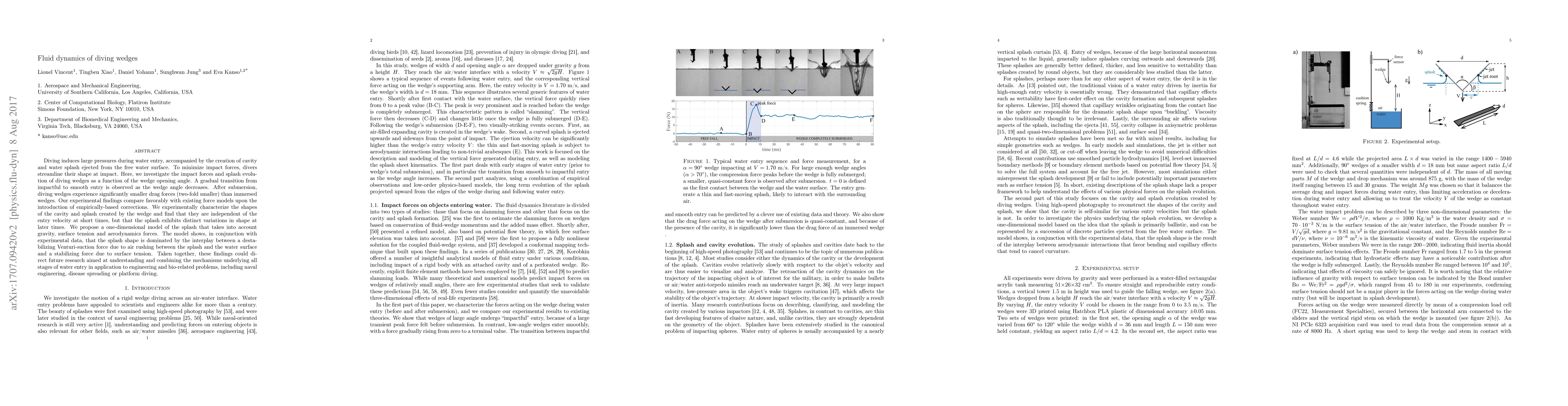 The paper presents an experimental and theoretical framework for understanding the fluid dynamics of diving wedges, including a one-dimensional splash model considering gravity, surface tension, and aerodynamic forces.