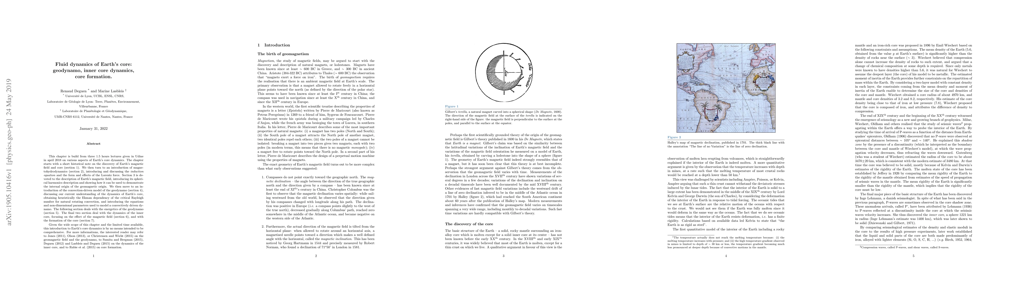 This chapter is build from three 1.5 hours lectures given in Udine in april 2018 on various aspects of Earth's core dynamics. The chapter starts with a short historical note on the discovery of Earth's magnetic field and core (section 1). We then turn to an introduction of magnetohydrodynamics (section 2), introducing and discussing the induction equation and the form and effects of the Lorentz force. Section 3 is devoted to the description of Earth's magnetic field, introducing its spherical harmonics description and showing how it can be used to demonstrate the internal origin of the geomagnetic origin. We then move to an introduction of the convection-driven model of the geodynamo (section 4), discussing our current understanding of the dynamics of Earth's core, obtaining heuristically the Ekman dependency of the critical Rayleigh number for natural rotating convection, and introducing the equations and non-dimensional parameters used to model a convectively driven dynamo. The following section deals with the energetics of the geodynamo (section 5). The final two section deal with the dynamics of the inner core, focusing on the effect of the magnetic field (section 6), and with the formation of the core (section 7). Given the wide scope of this chapter and the limited time available, this introduction to Earth's core dynamics is by no means intended to be comprehensive. For more informations, the interested reader may refer to Jones (2011), Olson (2013), or Christensen and Wicht (2015) on the geomagnetic field and the geodynamo, to Sumita and Bergman (2015), Deguen (2012) and Lasbleis and Deguen (2015) on the dynamics of the inner core, and to Rubie et al. (2015) on core formation.