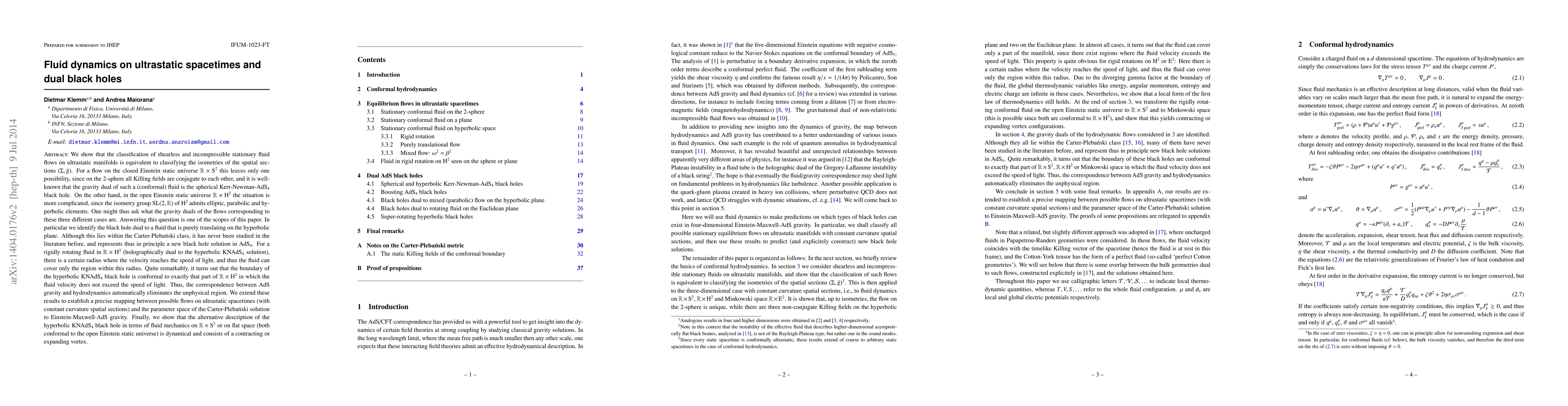 We show that the classification of shearless and incompressible stationary fluid flows on ultrastatic manifolds is equivalent to classifying the isometries of the spatial sections. For a flow on R x S$^2$ this leaves only one possibility, since on the 2-sphere all Killing fields are conjugate to each other, and it is well-known that the gravity dual of such a (conformal) fluid is the spherical KNAdS$_4$ black hole. On the other hand, in R x H$^2$ the situation is more complicated, since the isometry group of H$^2$ admits elliptic, parabolic and hyperbolic elements. One might thus ask what the gravity duals of the flows corresponding to these three different cases are. Answering this question is one of the scopes of this paper. In particular we identify the black hole dual to a fluid that is purely translating on the hyperbolic plane. Although this lies within the Carter-Plebanski (CP) class, it has never been studied in the literature before, and represents thus in principle a new black hole solution in AdS$_4$. For a rigidly rotating fluid in R x H$^2$ (holographically dual to the hyperbolic KNAdS$_4$ solution), there is a certain radius where the velocity reaches the speed of light, and thus the fluid can cover only the region within this radius. Quite remarkably, it turns out that the boundary of the hyperbolic KNAdS$_4$ black hole is conformal to exactly that part of R x H$^2$ in which the fluid velocity does not exceed the speed of light. We extend these results to establish a precise mapping between possible flows on ultrastatic spacetimes (with constant curvature spatial sections) and the parameter space of the CP solution. Finally, we show that the alternative description of the hyperbolic KNAdS$_4$ black hole in terms of fluid mechanics on R x S$^2$ or on flat space is dynamical and consists of a contracting or expanding vortex.