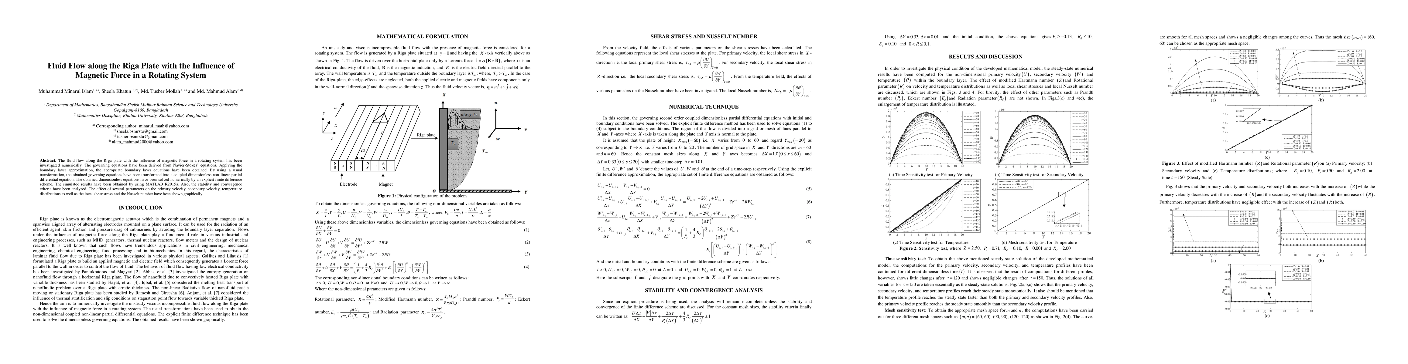 The fluid flow along the Riga plate with the influence of magnetic force in a rotating system has been investigated numerically. The governing equations have been derived from Navier-Stokes equations. Applying the boundary layer approximation, the appropriate boundary layer equations have been obtained. By using usual transformation, the obtained governing equations have been transformed into a coupled dimensionless non-linear partial differential equation. The obtained dimensionless equations have been solved numerically by explicit finite difference scheme. The simulated results have been obtained by using MATLAB R2015a. Also the stability and convergence criteria have been analyzed. The effect of several parameters on the primary velocity, secondary velocity, temperature distributions as well as local shear stress and Nusselt number have been shown graphically.