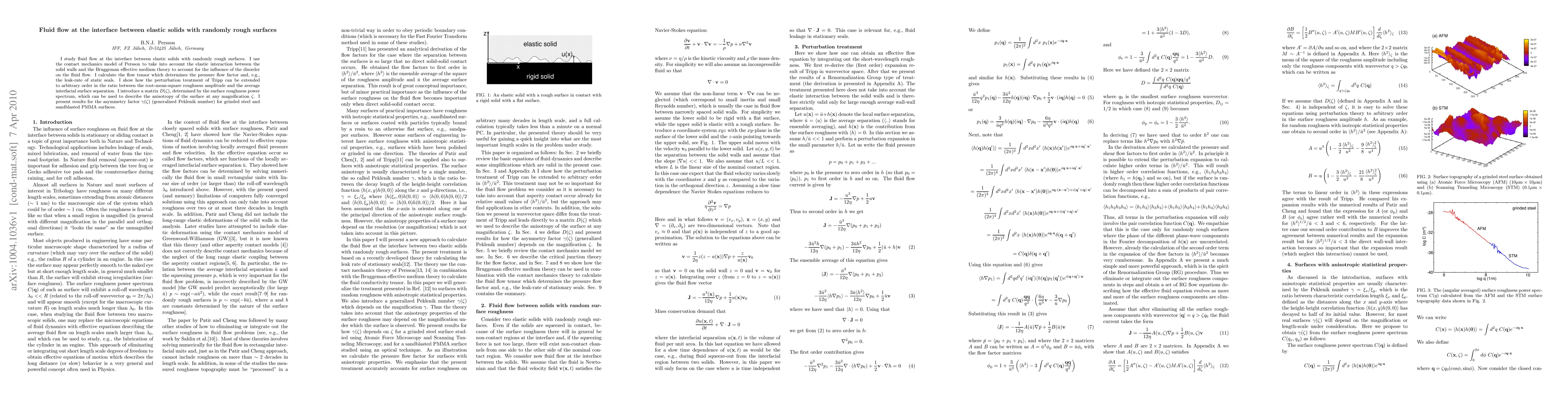 This paper investigates fluid flow dynamics at the interface between elastic solids with randomly rough surfaces, employing Persson's contact mechanics model and Bruggeman's effective medium theory. It extends Tripp's perturbation treatment to arbitrary order and introduces a matrix D(Zeta) to describe surface anisotropy, presenting results for the asymmetry factor Gamma(Zeta) for specific material surfaces.