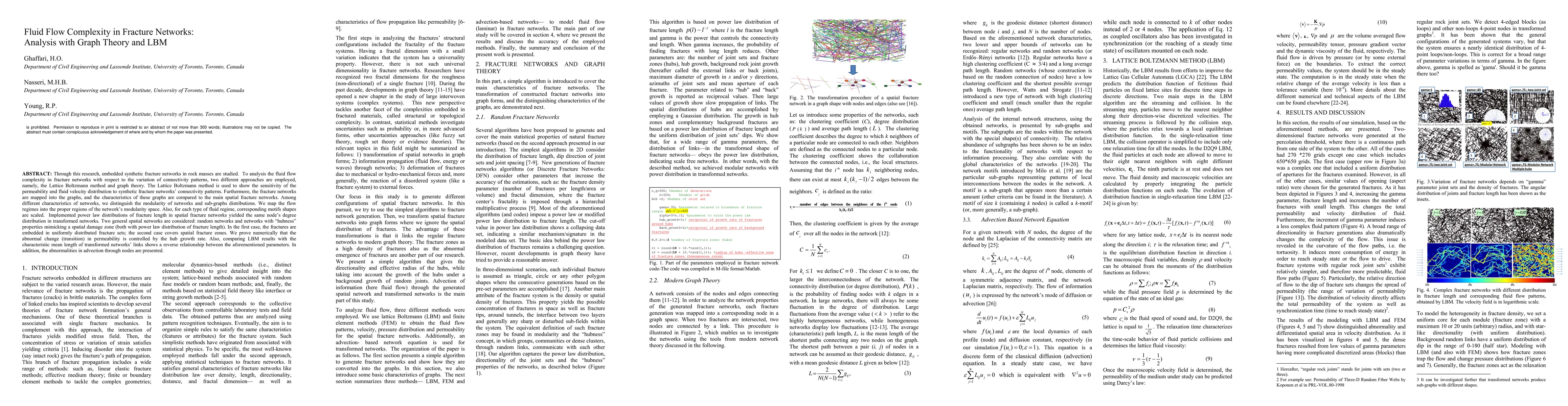 Through this research, embedded synthetic fracture networks in rock masses are studied. To analysis the fluid flow complexity in fracture networks with respect to the variation of connectivity patterns, two different approaches are employed, namely, the Lattice Boltzmann method and graph theory. The Lattice Boltzmann method is used to show the sensitivity of the permeability and fluid velocity distribution to synthetic fracture networks' connectivity patterns. Furthermore, the fracture networks are mapped into the graphs, and the characteristics of these graphs are compared to the main spatial fracture networks. Among different characteristics of networks, we distinguish the modularity of networks and sub-graphs distributions. We map the flow regimes into the proper regions of the network's modularity space. Also, for each type of fluid regime, corresponding motifs shapes are scaled. Implemented power law distributions of fracture length in spatial fracture networks yielded the same node's degree distribution in transformed networks. Two general spatial networks are considered: random networks and networks with "hubness" properties mimicking a spatial damage zone (both with power law distribution of fracture length). In the first case, the fractures are embedded in uniformly distributed fracture sets; the second case covers spatial fracture zones. We prove numerically that the abnormal change (transition) in permeability is controlled by the hub growth rate. Also, comparing LBM results with the characteristic mean length of transformed networks' links shows a reverse relationship between the aforementioned parameters. In addition, the abnormalities in advection through nodes are presented.