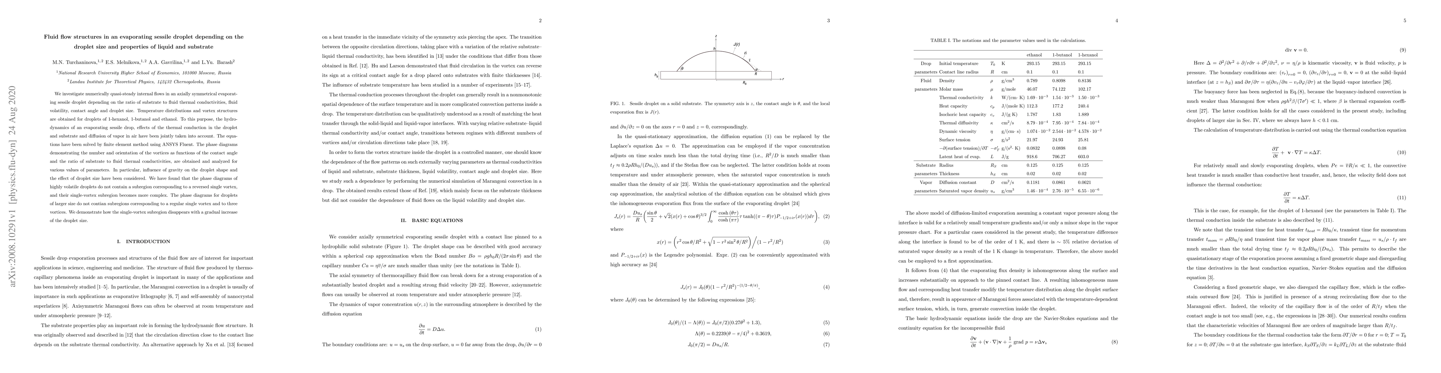 We investigate numerically quasi-steady internal flows in an axially symmetrical evaporating sessile droplet depending on the ratio of substrate to fluid thermal conductivities, fluid volatility, contact angle and droplet size. Temperature distributions and vortex structures are obtained for droplets of 1-hexanol, 1-butanol and ethanol. To this purpose, the hydrodynamics of an evaporating sessile drop, effects of the thermal conduction in the droplet and substrate and diffusion of vapor in air have been jointly taken into account. The equations have been solved by finite element method using ANSYS Fluent. The phase diagrams demonstrating the number and orientation of the vortices as functions of the contact angle and the ratio of substrate to fluid thermal conductivities, are obtained and analyzed for various values of parameters. In particular, influence of gravity on the droplet shape and the effect of droplet size have been considered. We have found that the phase diagrams of highly volatile droplets do not contain a subregion corresponding to a reversed single vortex, and their single-vortex subregion becomes more complex. The phase diagrams for droplets of larger size do not contian subregions corresponding to a regular single vortex and to three vortices. We demonstrate how the single-vortex subregion disappears with a gradual increase of the droplet size.