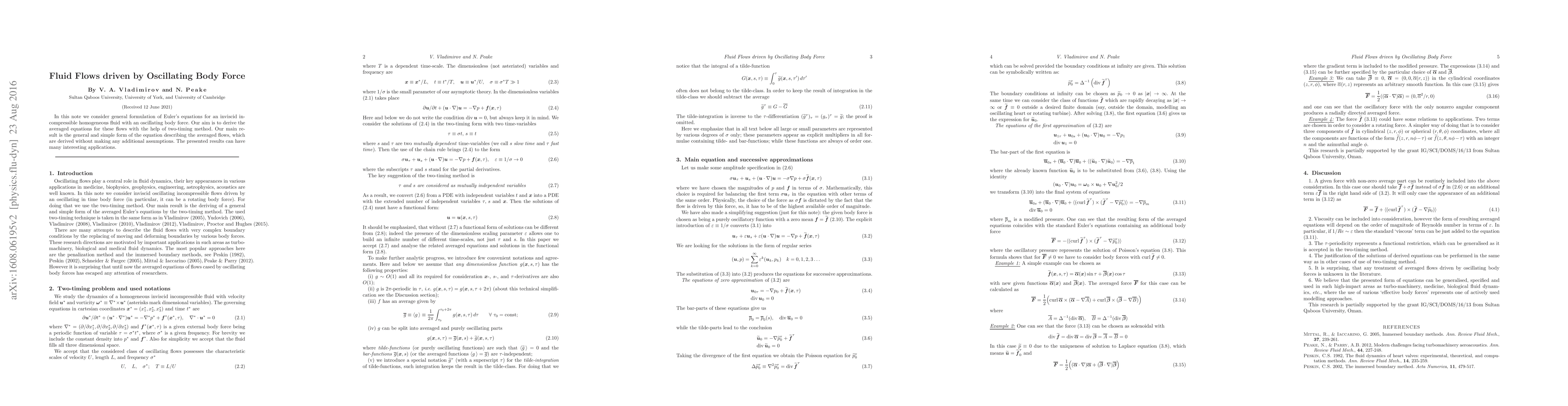Researchers derived a general equation for fluid flows driven by oscillating body forces without additional assumptions using the two-timing method. This discovery has potential applications in various fields with its simple and accurate form of averaged equations.