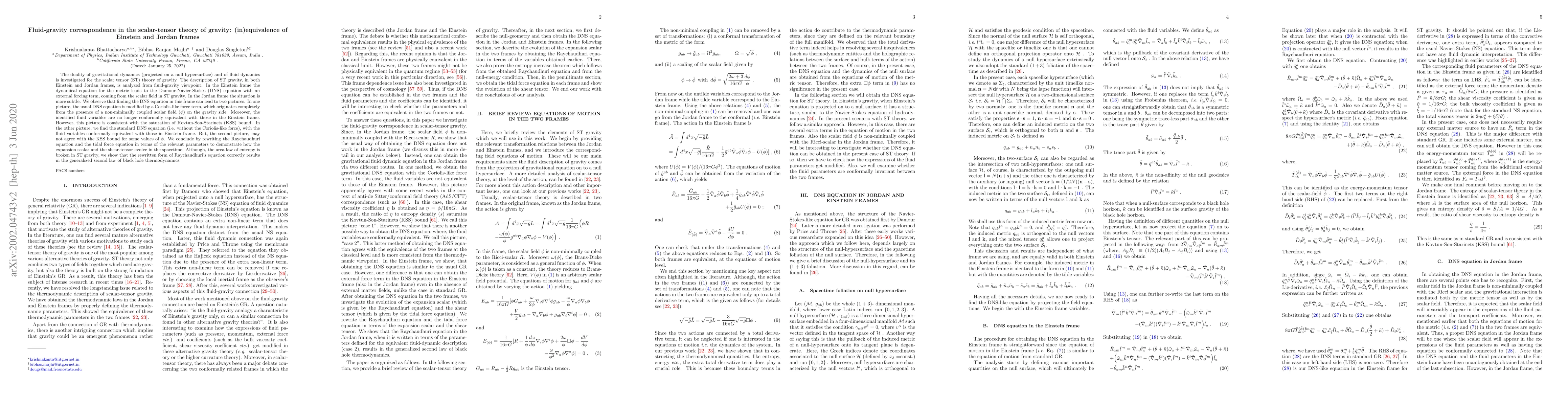 This paper investigates the fluid-gravity correspondence in scalar-tensor (ST) gravity, comparing Einstein and Jordan frames. In the Einstein frame, ST gravity leads to a Damour-Navier-Stokes equation with an external forcing term from the scalar field. In the Jordan frame, two interpretations arise: one with a modified DNS equation and non-conformal fluid variables, and another with standard DNS but potential KSS bound violations. The study concludes with a generalized second law of black hole thermodynamics.
