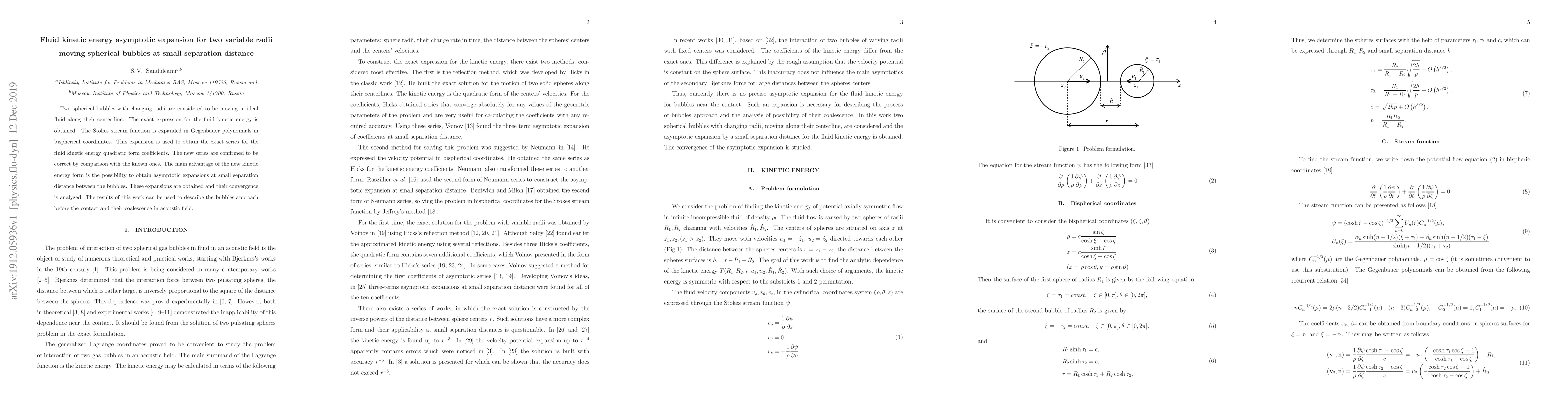 Researchers developed a new method to calculate kinetic energy of moving spherical bubbles with changing radii, enabling accurate asymptotic expansions at small separation distances, which can help describe bubble behavior in acoustic fields.