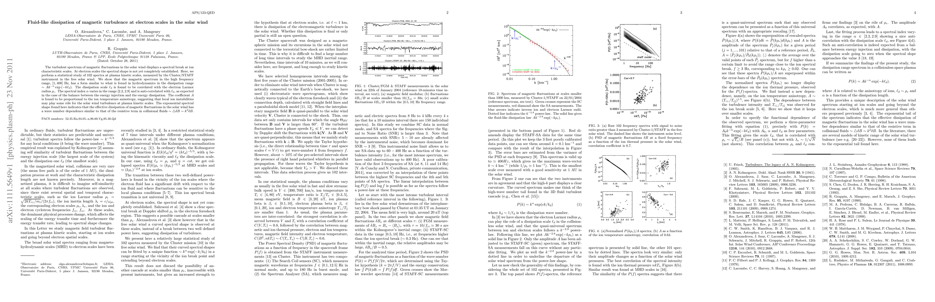 This study reveals that the magnetic turbulence spectrum in the solar wind exhibits a fluid-like dissipation at electron scales, characterized by a spectral shape similar to hydrodynamic dissipation in the dissipation range. The dissipation scale correlates with the electron Larmor radius, indicating a wave number dependence akin to the resistive term in collisional fluids.