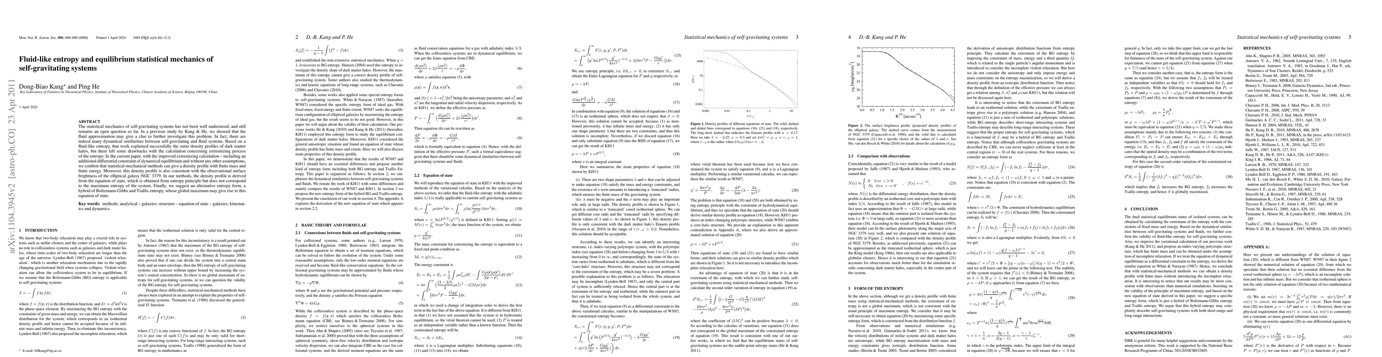 The statistical mechanics of self-gravitating systems has not been well understood, and still remains an open question so far. In a previous study by Kang & He, we showed that the fluid approximation may give a clue to further investigate this problem. In fact, there are indeed many dynamical similarities between self-gravitating and fluid systems. Based on a fluid-like entropy, that work explained successfully the outer density profiles of dark matter halos, but there left some drawbacks with the calculation concerning extremizing process of the entropy. In the current paper, with the improved extremizing calculation -- including an additional differential constraint of dynamical equilibrium and without any other assumptions, we confirm that statistical-mechanical methods can give a density profile with finite mass and finite energy. Moreover, this density profile is also consistent with the observational surface brightness of the elliptical galaxy NGC 3379. In our methods, the density profile is derived from the equation of state, which is obtained from entropy principle but does not correspond to the maximum entropy of the system. Finally, we suggest an alternative entropy form, a hybrid of Boltzmann-Gibbs and Tsallis entropy, whose global maximum may give rise to this equation of state.