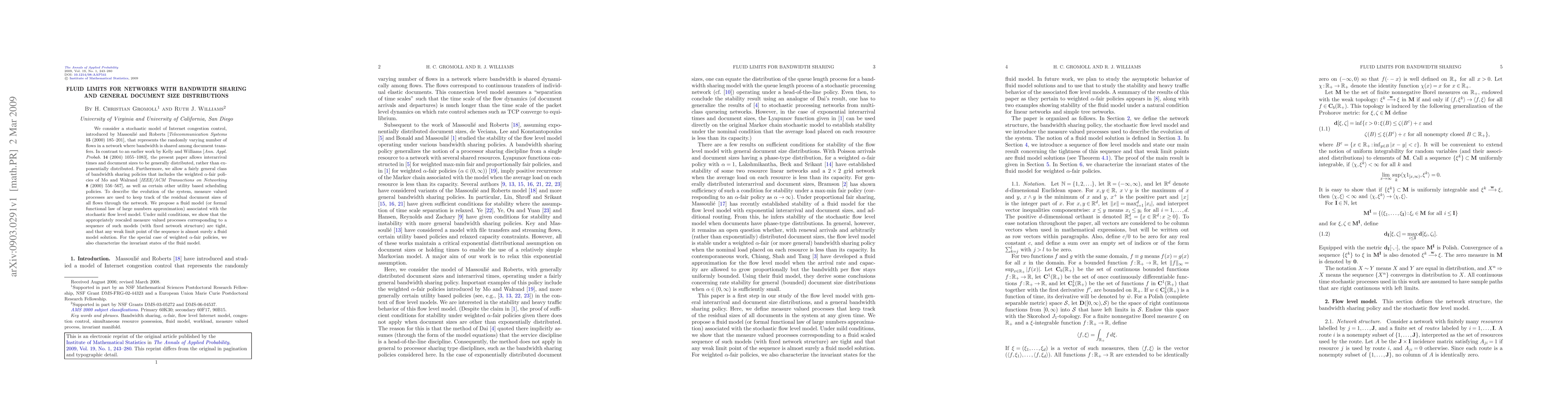 We consider a stochastic model of Internet congestion control, introduced by Massouli\'{e} and Roberts [Telecommunication Systems 15 (2000) 185--201], that represents the randomly varying number of flows in a network where bandwidth is shared among document transfers. In contrast to an earlier work by Kelly and Williams [Ann. Appl. Probab. 14 (2004) 1055--1083], the present paper allows interarrival times and document sizes to be generally distributed, rather than exponentially distributed. Furthermore, we allow a fairly general class of bandwidth sharing policies that includes the weighted $\alpha$-fair policies of Mo and Walrand [IEEE/ACM Transactions on Networking 8 (2000) 556--567], as well as certain other utility based scheduling policies. To describe the evolution of the system, measure valued processes are used to keep track of the residual document sizes of all flows through the network. We propose a fluid model (or formal functional law of large numbers approximation) associated with the stochastic flow level model. Under mild conditions, we show that the appropriately rescaled measure valued processes corresponding to a sequence of such models (with fixed network structure) are tight, and that any weak limit point of the sequence is almost surely a fluid model solution. For the special case of weighted $\alpha$-fair policies, we also characterize the invariant states of the fluid model.