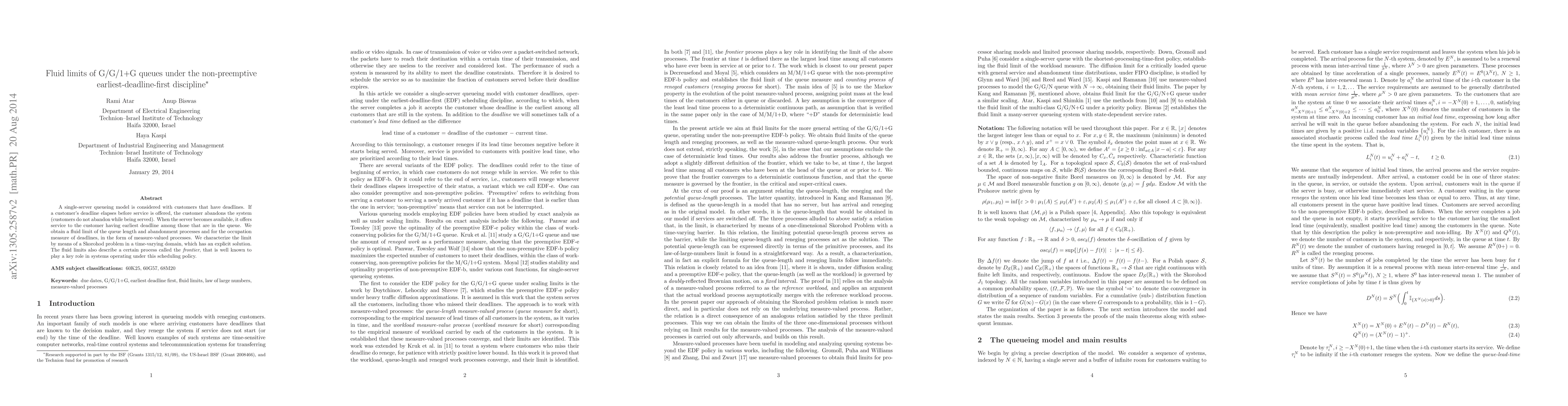This paper studies the fluid limits of a single-server queue with customers having deadlines, where service is prioritized to the customer with the earliest deadline. The authors derive fluid limits for queue length, abandonment, and deadline occupation measures, characterized by a Skorohod problem solution, and highlight the frontier process's significance under the earliest-deadline-first scheduling policy.