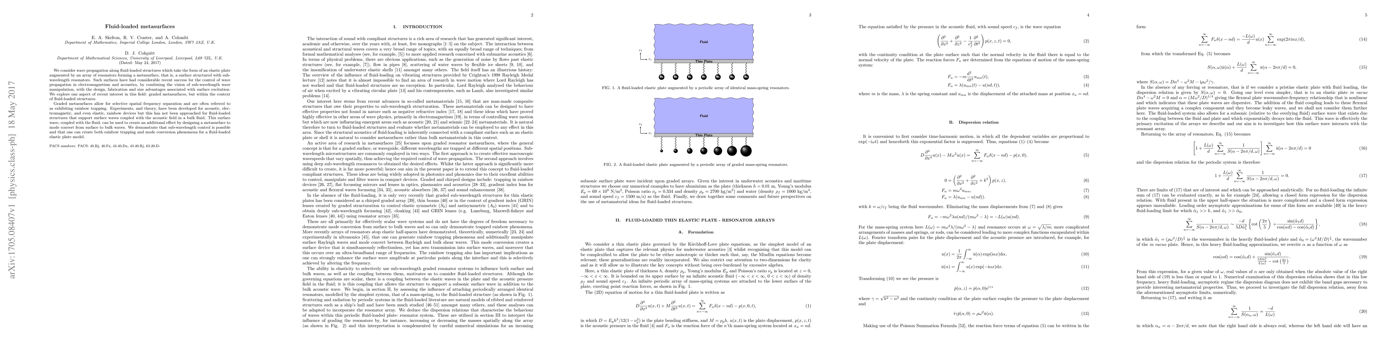 We consider wave propagation along fluid-loaded structures which take the form of an elastic plate augmented by an array of resonators forming a metasurface, that is, a surface structured with sub-wavelength resonators. Such surfaces have had considerable recent success for the control of wave propagation in electromagnetism and acoustics, by combining the vision of sub-wavelength wave manipulation, with the design, fabrication and size advantages associated with surface excitation. We explore one aspect of recent interest in this field: graded metasurfaces, but within the context of fluid-loaded structures. Graded metasurfaces allow for selective spatial frequency separation and are often referred to as exhibiting rainbow trapping. Experiments, and theory, have been developed for acoustic, electromagnetic, and even elastic, rainbow devices but this has not been approached for fluid-loaded structures that support surface waves coupled with the acoustic field in a bulk fluid. This surface wave, coupled with the fluid, can be used to create an additional effect by designing a metasurface to mode convert from surface to bulk waves. We demonstrate that sub-wavelength control is possible and that one can create both rainbow trapping and mode conversion phenomena for a fluid-loaded elastic plate model.