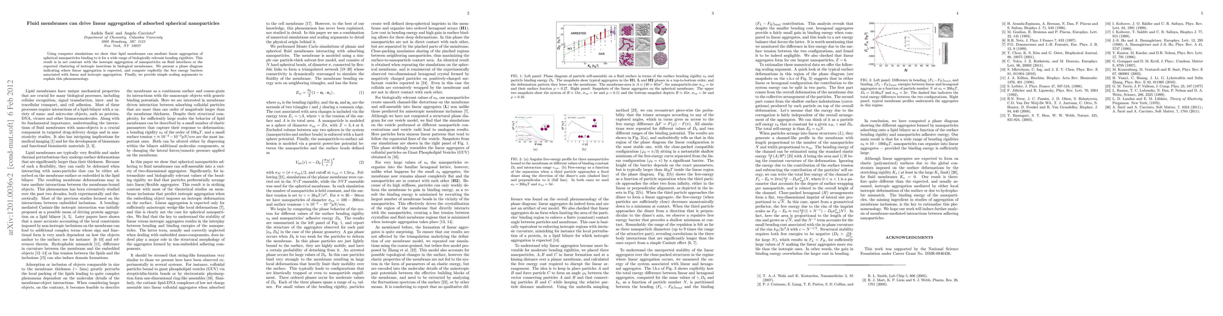 Computer simulations reveal that fluid lipid membranes can induce linear aggregation of spherical nanoparticles adsorbed onto them, contrasting with isotropic aggregation on fluid interfaces. A phase diagram is presented to predict conditions favoring linear aggregation, along with calculations of associated free energy barriers.