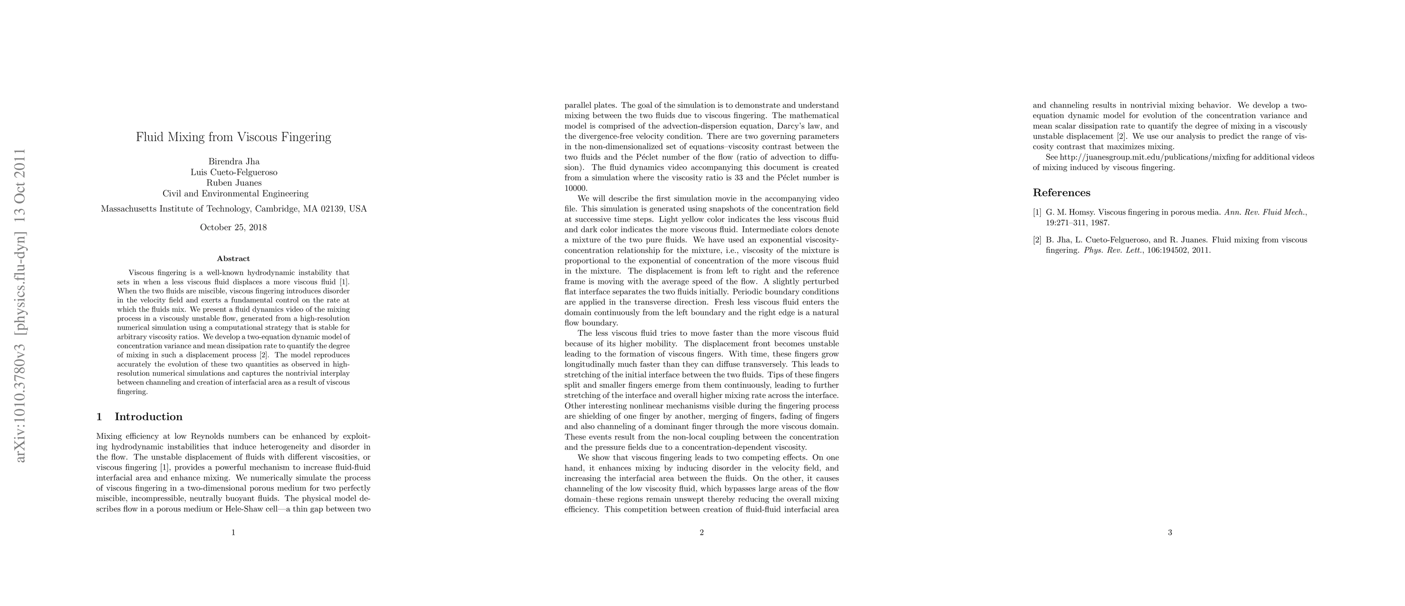 Viscous fingering is a well-known hydrodynamic instability that sets in when a less viscous fluid displaces a more viscous fluid. When the two fluids are miscible, viscous fingering introduces disorder in the velocity field and exerts a fundamental control on the rate at which the fluids mix. We present a fluid dynamics video of the mixing process in a viscously unstable flow, generated from a high-resolution numerical simulation using a computational strategy that is stable for arbitrary viscosity ratios. We develop a two-equation dynamic model of concentration variance and mean dissipation rate to quantify the degree of mixing in such a displacement process. The model reproduces accurately the evolution of these two quantities as observed in high-resolution numerical simulations and captures the nontrivial interplay between channeling and creation of interfacial area as a result of viscous fingering.