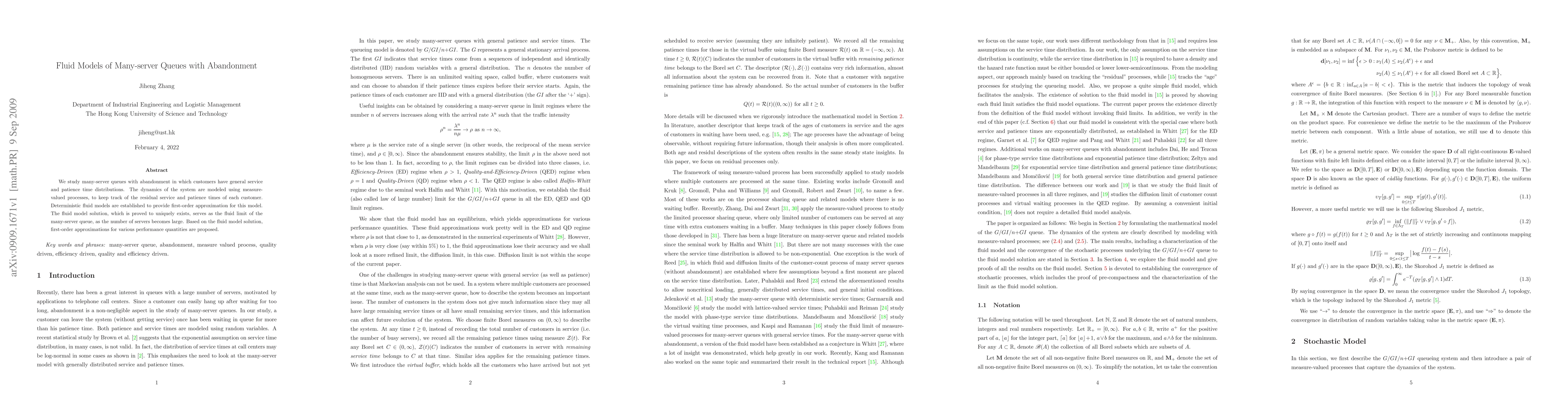 This paper develops deterministic fluid models for many-server queues with abandonment, using measure-valued processes to track customer service and patience times. The fluid model uniquely exists and serves as the first-order approximation for performance metrics as the number of servers increases.