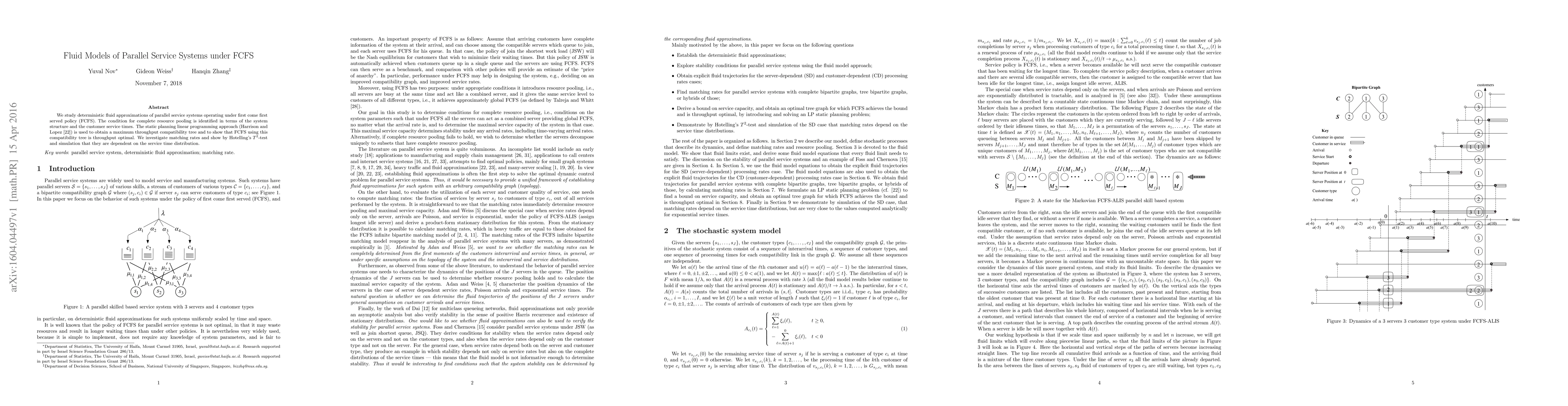 This paper explores deterministic fluid models for parallel service systems under FCFS, identifying conditions for complete resource pooling based on system structure and service times. It employs a linear programming approach to demonstrate throughput optimality and investigates how matching rates vary with service time distribution using Hotelling's $T^2$-test and simulations.