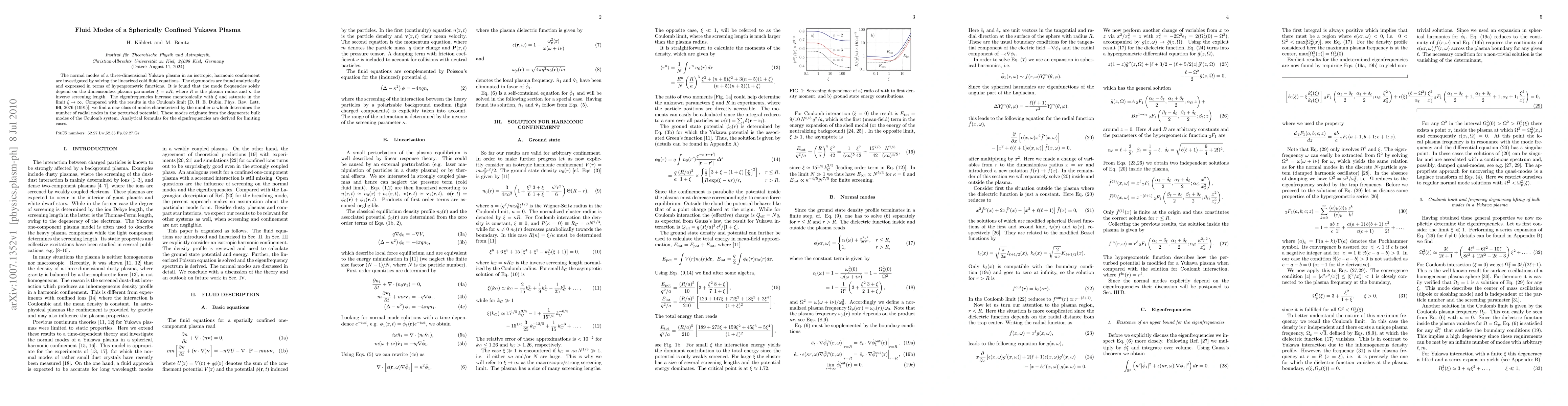 The normal modes of a three-dimensional Yukawa plasma in an isotropic, harmonic confinement are investigated by solving the linearized cold fluid equations. The eigenmodes are found analytically and expressed in terms of hypergeometric functions. It is found that the mode frequencies solely depend on the dimensionless plasma parameter $\xi=\kappa R$, where $R$ is the plasma radius and $\kappa$ the inverse screening length. The eigenfrequencies increase monotonically with $\xi$ and saturate in the limit $\xi\to\infty$. Compared with the results in the Coulomb limit~[D. H. E. Dubin, Phys. Rev. Lett. \textbf{66}, 2076 (1991)], we find a new class of modes characterized by the number $n$ which determines the number of radial nodes in the perturbed potential. These modes originate from the degenerate bulk modes of the Coulomb system. Analytical formulas for the eigenfrequencies are derived for limiting cases.