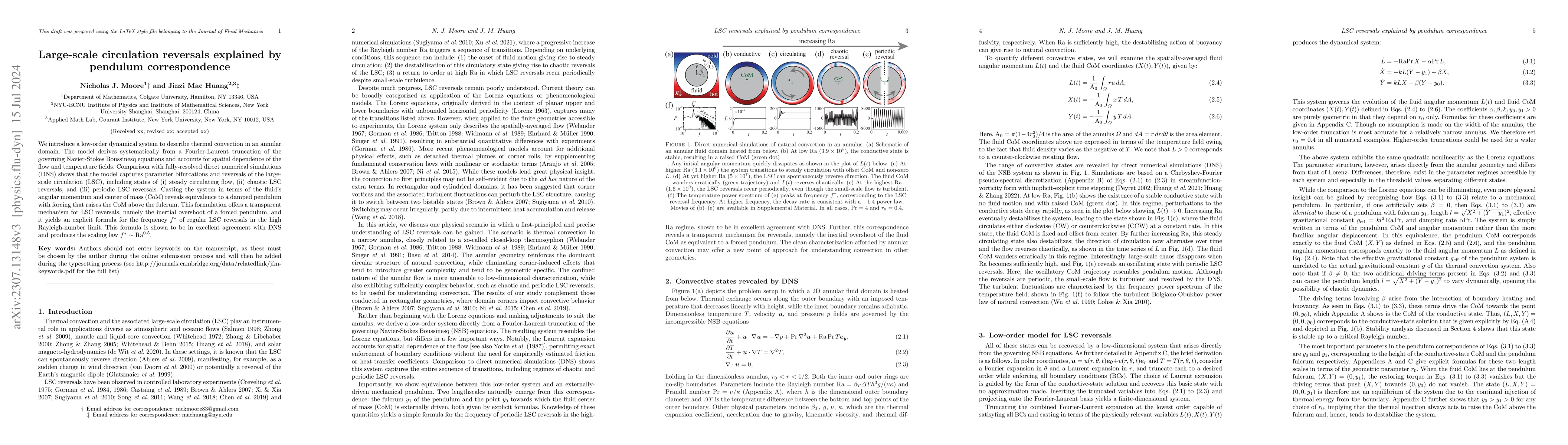 The paper introduces a low-dimensional dynamical system to model thermal convection in an annulus, revealing that the large-scale circulation reversals can be explained through a fluid pendulum analogy. The model accurately predicts steady, chaotic, and periodic reversals of the large-scale circulation, offering a clear mechanism for these phenomena.