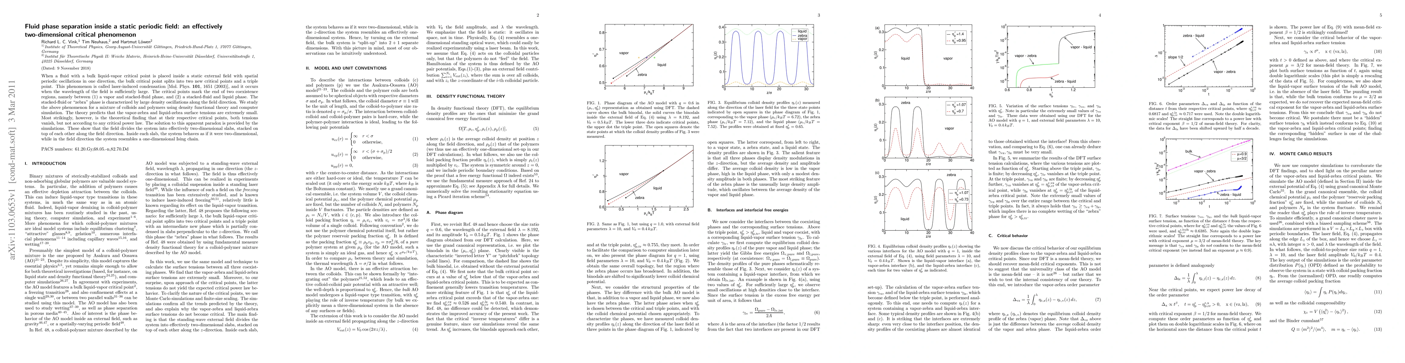 When a fluid with a bulk liquid-vapor critical point is placed inside a static external field with spatial periodic oscillations in one direction, the bulk critical point splits into two new critical points and a triple point. This phenomenon is called laser-induced condensation [Mol. Phys. Vol. 101, Pg. 1651 (2003)], and it occurs when the wavelength of the field is sufficiently large. The critical points mark the end of two coexistence regions, namely between (1) a vapor and stacked-fluid phase, and (2) a stacked-fluid and liquid phase. The stacked-fluid or "zebra" phase is characterized by large density oscillations along the field direction. We study the above phenomenon for a mixture of colloids and polymers using density functional theory and computer simulation. The theory predicts that the vapor-zebra and liquid-zebra surface tensions are extremely small. Most strikingly, however, is the theoretical finding that at their respective critical points, both tensions vanish, but not according to any critical power law. The solution to this apparent paradox is provided by the simulations. These show that the field divides the system into effectively two-dimensional slabs, stacked on top of each other along the field direction. Inside each slab, the system behaves as if it were two-dimensional, while in the field direction the system resembles a one-dimensional Ising chain.