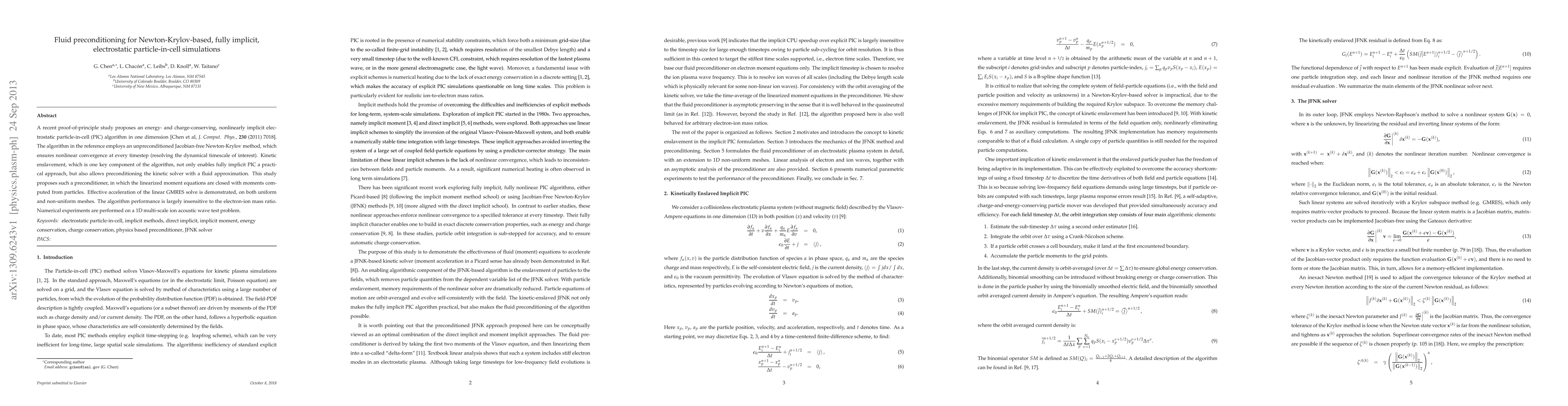 A recent proof-of-principle study proposes an energy- and charge-conserving, nonlinearly implicit electrostatic particle-in-cell (PIC) algorithm in one dimension [Chen et al, J. Comput. Phys., 230 (2011) 7018]. The algorithm in the reference employs an unpreconditioned Jacobian-free Newton-Krylov method, which ensures nonlinear convergence at every timestep (resolving the dynamical timescale of interest). Kinetic enslavement, which is one key component of the algorithm, not only enables fully implicit PIC a practical approach, but also allows preconditioning the kinetic solver with a fluid approximation. This study proposes such a preconditioner, in which the linearized moment equations are closed with moments computed from particles. Effective acceleration of the linear GMRES solve is demonstrated, on both uniform and non-uniform meshes. The algorithm performance is largely insensitive to the electron-ion mass ratio. Numerical experiments are performed on a 1D multi-scale ion acoustic wave test problem.