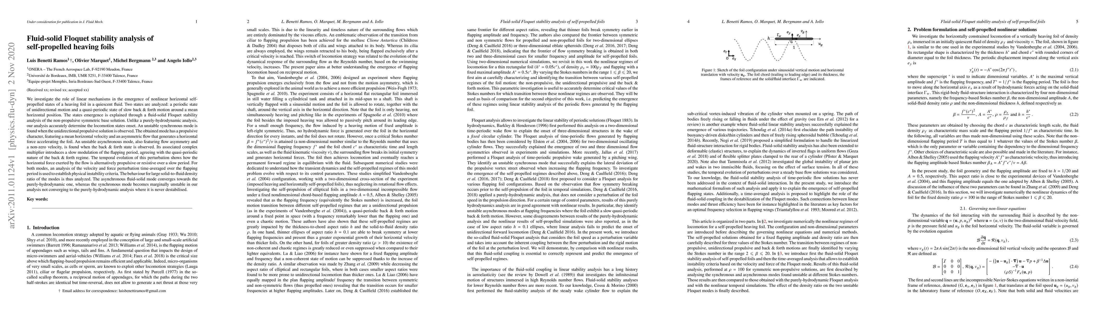 Researchers studied self-propelled heaving foils in a fluid using Floquet stability analysis, finding two unstable modes of motion: one for unidirectional movement and another for slow back-and-forth motion, which converges to purely-hydrodynamic behavior.