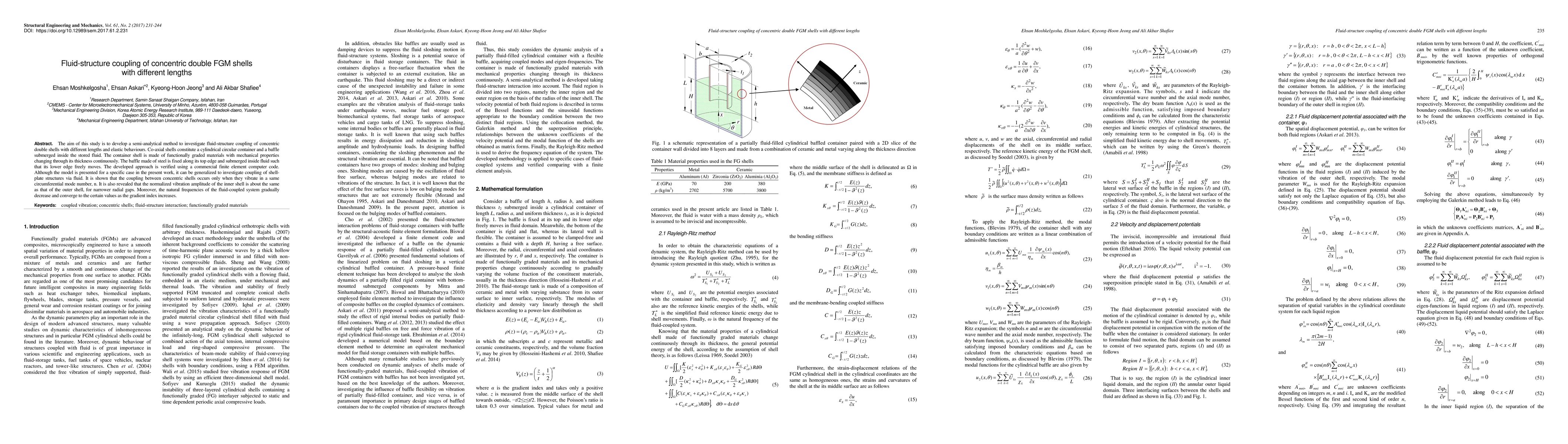 The aim of this study is to develop a semi-analytical method to investigate fluid-structure coupling of concentric double shells with different lengths and elastic behaviours. Co-axial shells constitute a cylindrical circular container and a baffle submerged inside the stored fluid. The container shell is made of functionally graded materials with mechanical properties changing through its thickness continuously. The baffle made of steel is fixed along its top edge and submerged inside fluid such that its lower edge freely moves. The developed approach is verified using a commercial finite element computer code. Although the model is presented for a specific case in the present work, it can be generalized to investigate coupling of shellplate structures via fluid. It is shown that the coupling between concentric shells occurs only when they vibrate in a same circumferential mode number, n. It is also revealed that the normalized vibration amplitude of the inner shell is about the same as that of the outer shell, for narrower radial gaps. Moreover, the natural frequencies of the fluid-coupled system gradually decrease and converge to the certain values as the gradient index increases.
