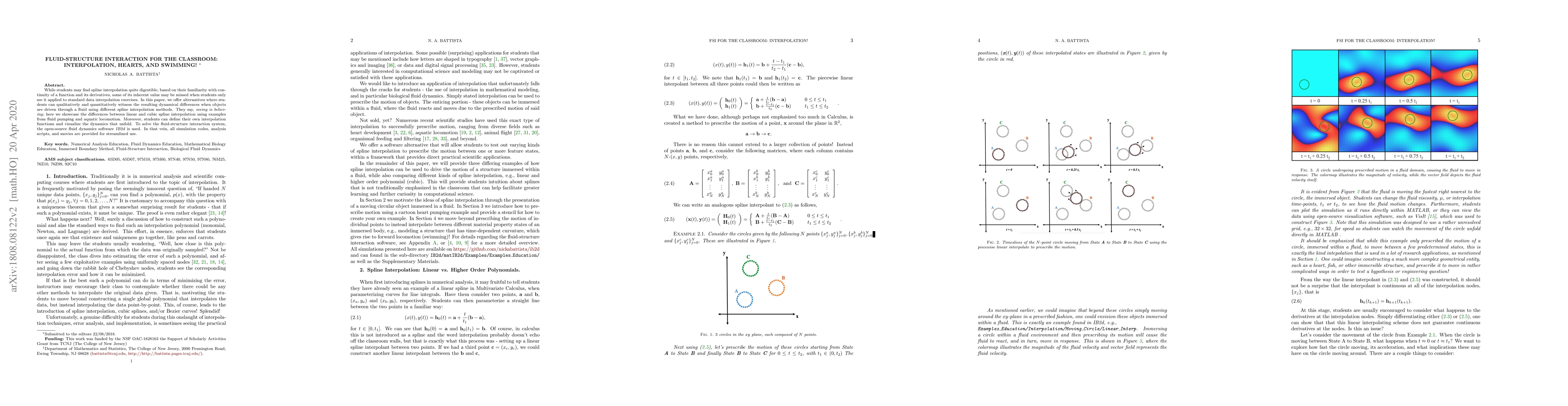 While students may find spline interpolation quite digestible, based on their familiarity with continuity of a function and its derivatives, some of its inherent value may be missed when students only see it applied to standard data interpolation exercises. In this paper, we offer alternatives where students can qualitatively and quantitatively witness the resulting dynamical differences when objects are driven through a fluid using different spline interpolation methods. They say, seeing is believing; here we showcase the differences between linear and cubic spline interpolation using examples from fluid pumping and aquatic locomotion. Moreover, students can define their own interpolation functions and visualize the dynamics that unfold. To solve the fluid-structure interaction system, the open-source fluid dynamics software IB2d is used. In that vein, all simulation codes, analysis scripts, and movies are provided for streamlined use.