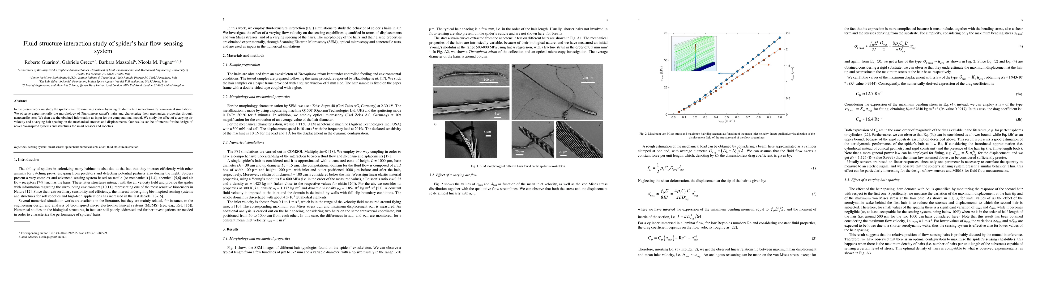 In the present work we study the spider's hair flow-sensing system by using fluid-structure interaction (FSI) numerical simulations. We observe experimentally the morphology of Theraphosa stirmi's hairs and characterize their mechanical properties through nanotensile tests. We then use the obtained information as input for the computational model. We study the effect of a varying air velocity and a varying hair spacing on the mechanical stresses and displacements. Our results can be of interest for the design of novel bio-inspired systems and structures for smart sensors and robotics.
