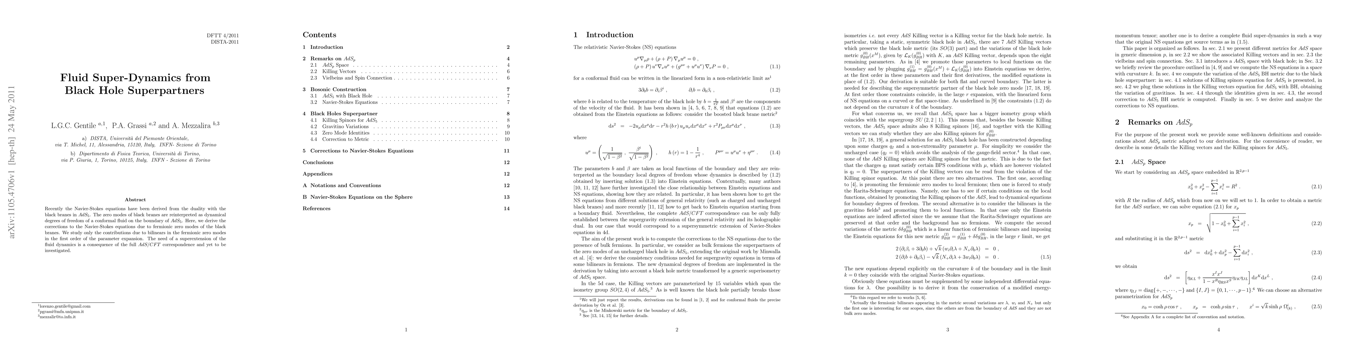 Recently the Navier-Stokes equations have been derived from the duality with the black branes in AdS_5. The zero modes of black branes are reinterpreted as dynamical degrees of freedom of a conformal fluid on the boundary of AdS_5. Here, we derive the corrections to the Navier-Stokes equations due to fermionic zero modes of the black branes. We study only the contributions due to bilinears in the fermionic zero modes in the first order of the parameter expansion. The need of a superextension of the fluid dynamics is a consequence of the full AdS/CFT correspondence and yet to be investigated.