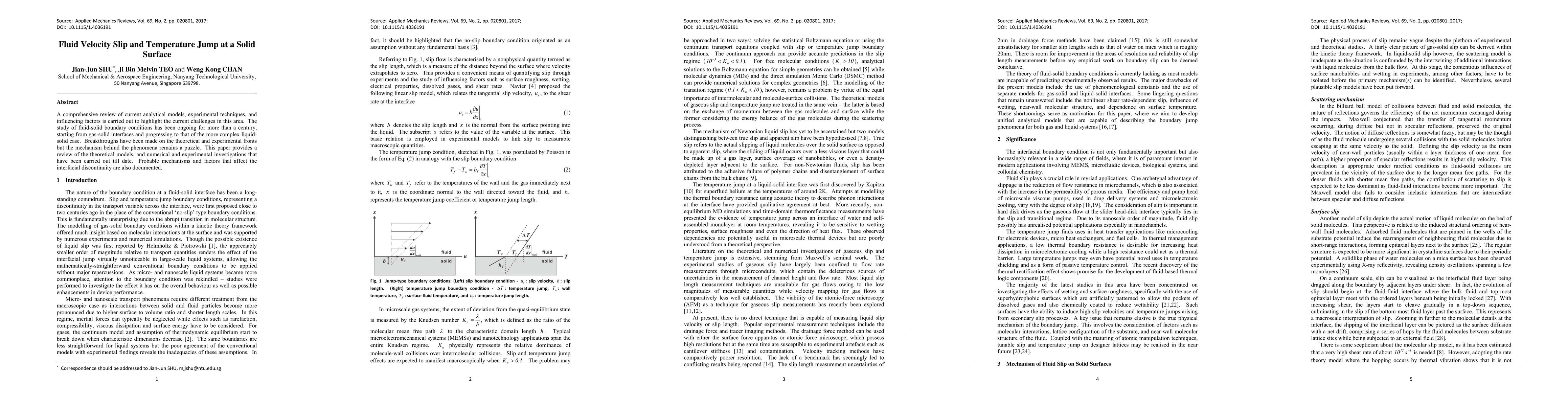 A comprehensive review of current analytical models, experimental techniques, and influencing factors is carried out to highlight the current challenges in this area. The study of fluid-solid boundary conditions has been ongoing for more than a century, starting from gas-solid interfaces and progressing to that of the more complex liquid-solid case. Breakthroughs have been made on the theoretical and experimental fronts but the mechanism behind the phenomena remains a puzzle. This paper provides a review of the theoretical models, and numerical and experimental investigations that have been carried out till date. Probable mechanisms and factors that affect the interfacial discontinuity are also documented.