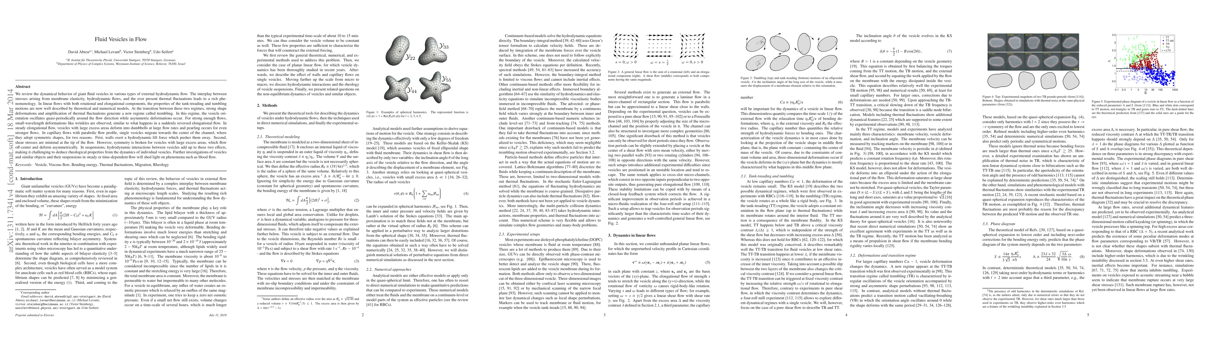 This paper reviews the complex dynamics of giant fluid vesicles under various hydrodynamic flows, highlighting phenomena such as tank-treading, tumbling, trembling, and pearling, and discusses how vesicle behavior informs understanding of biological flows like blood circulation.