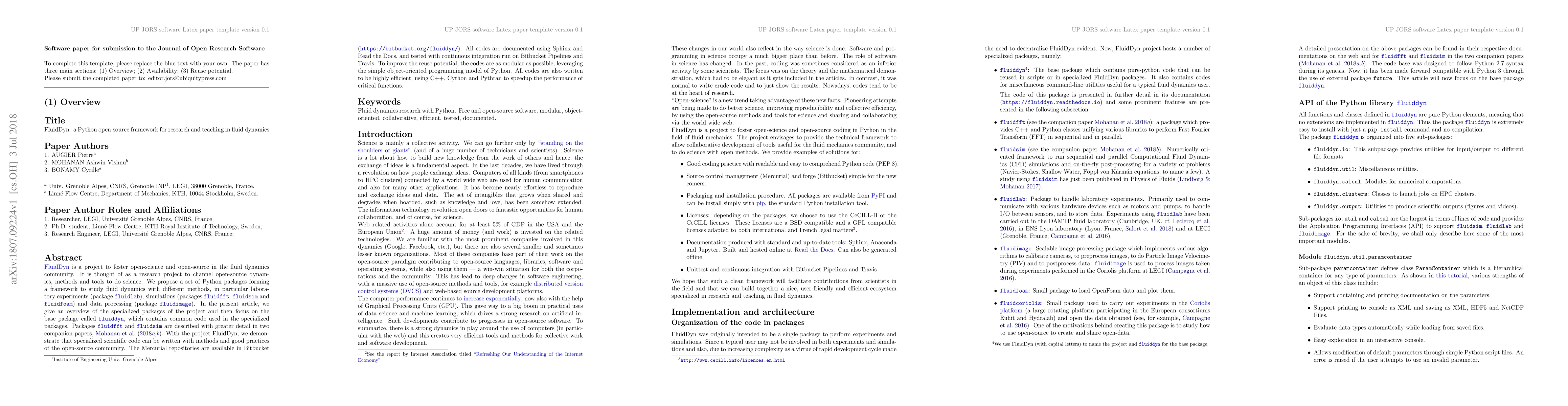 FluidDyn is an open-source Python framework for fluid dynamics research and education, comprising specialized packages for experiments, simulations, and data processing. The project emphasizes open-source practices, modularity, and efficiency through the use of C++, Cython, and Pythran.