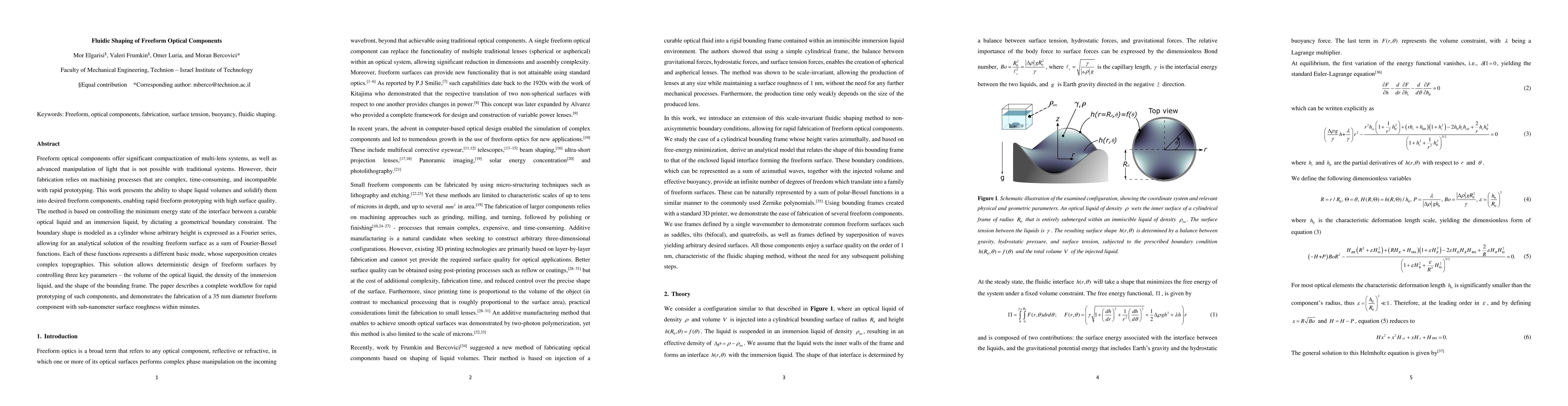 Freeform optical components offer significant compactization of multi-lens systems, as well as advanced manipulation of light that is not possible with traditional systems. However, their fabrication relies on machining processes that are complex, time-consuming, and incompatible with rapid prototyping. This work presents the ability to shape liquid volumes and solidify them into desired freeform components, enabling rapid freeform prototyping with high surface quality. The method is based on controlling the minimum energy state of the interface between a curable optical liquid and an immersion liquid, by dictating a geometrical boundary constraint. The boundary shape is modeled as a cylinder whose arbitrary height is expressed as a Fourier series, allowing for an analytical solution of the resulting freeform surface as a sum of Fourier-Bessel functions. Each of these functions represents a different basic mode, whose superposition creates complex topographies. This solution allows deterministic design of freeform surfaces by controlling three key parameters - the volume of the optical liquid, the density of the immersion liquid, and the shape of the bounding frame. The paper describes a complete workflow for rapid prototyping of such components, and demonstrates the fabrication of a 35 mm diameter freeform component with sub-nanometer surface roughness within minutes.