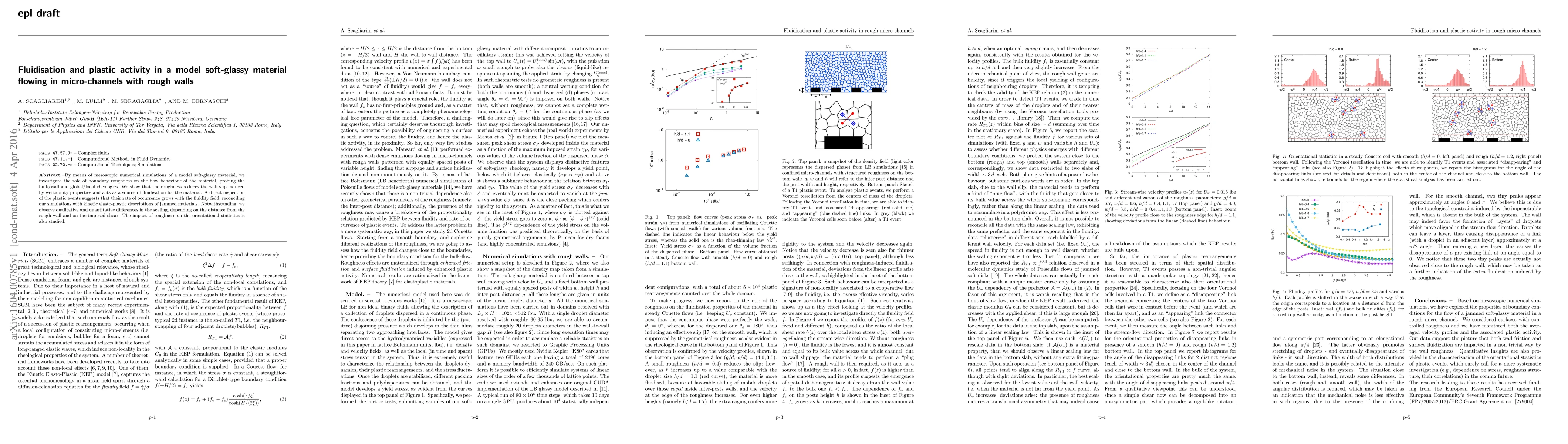 This study uses mesoscopic simulations to explore how boundary roughness influences the flow behavior of a soft-glassy material in micro-channels, revealing that roughness reduces wall slip and enhances fluidisation. The research also finds that plastic activity increases with fluidity, though scaling differences exist based on proximity to the rough wall and shear conditions.