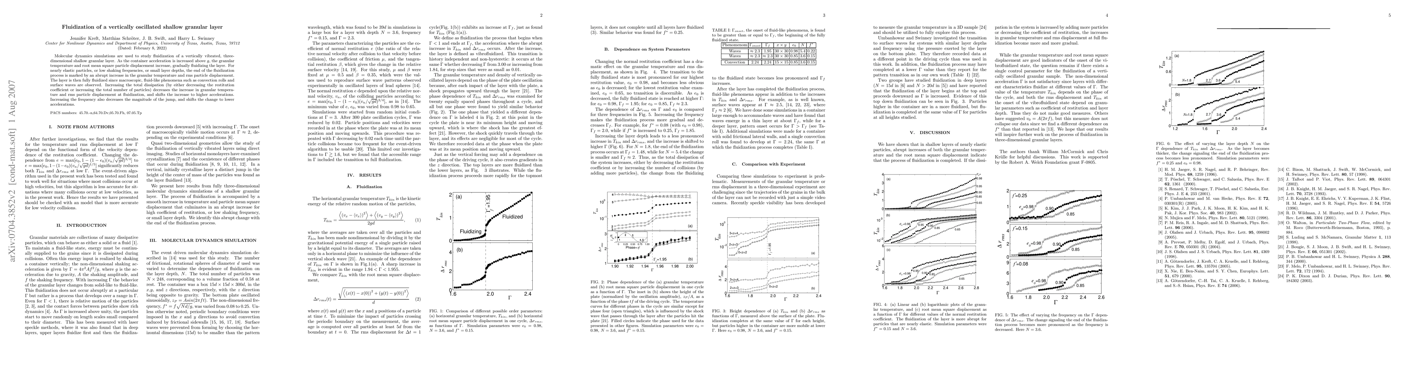 Molecular dynamics simulations were employed to study the fluidization of a vertically vibrated, shallow granular layer. The study varied parameters such as container acceleration, restitution coefficient, frequency, and layer depth to analyze their impact on granular temperature and root mean square particle displacement.