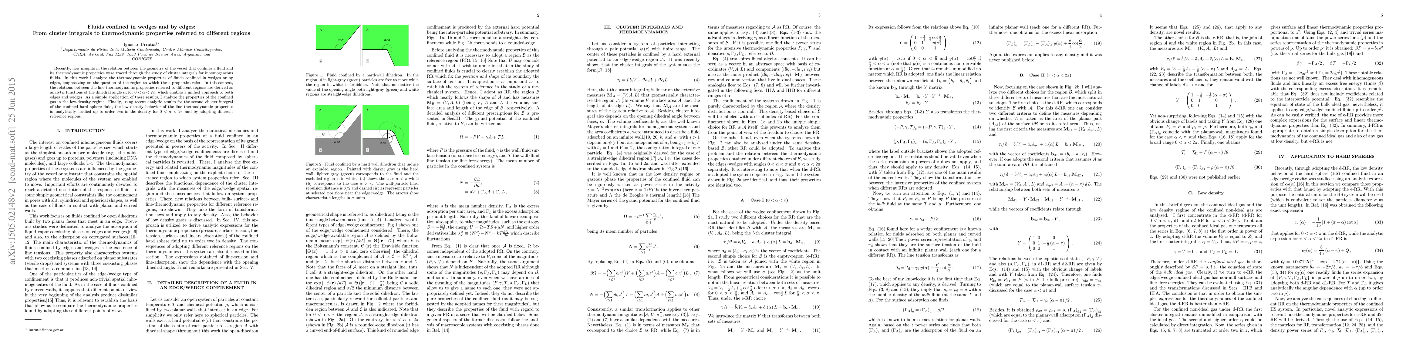 Recently, new insights in the relation between the geometry of the vessel that confines a fluid and its thermodynamic properties were traced through the study of cluster integrals for inhomogeneous fluids. In this work I analyze the thermodynamic properties of fluids confined in wedges or by edges, emphasizing on the question of the region to which these properties refer. In this context, the relations between the line-thermodynamic properties referred to different regions are derived as analytic functions of the dihedral angle $\alpha$ , for $0<\alpha<2\pi$ , which enables a unified approach to both edges and wedges. As a simple application of these results, I analyze the properties of the confined gas in the low-density regime. Finally, using recent analytic results for the second cluster integral of the confined hard sphere fluid, the low density behavior of the line thermodynamic properties is analytically studied up to order two in the density for $0<\alpha<2\pi$ and by adopting different reference regions.