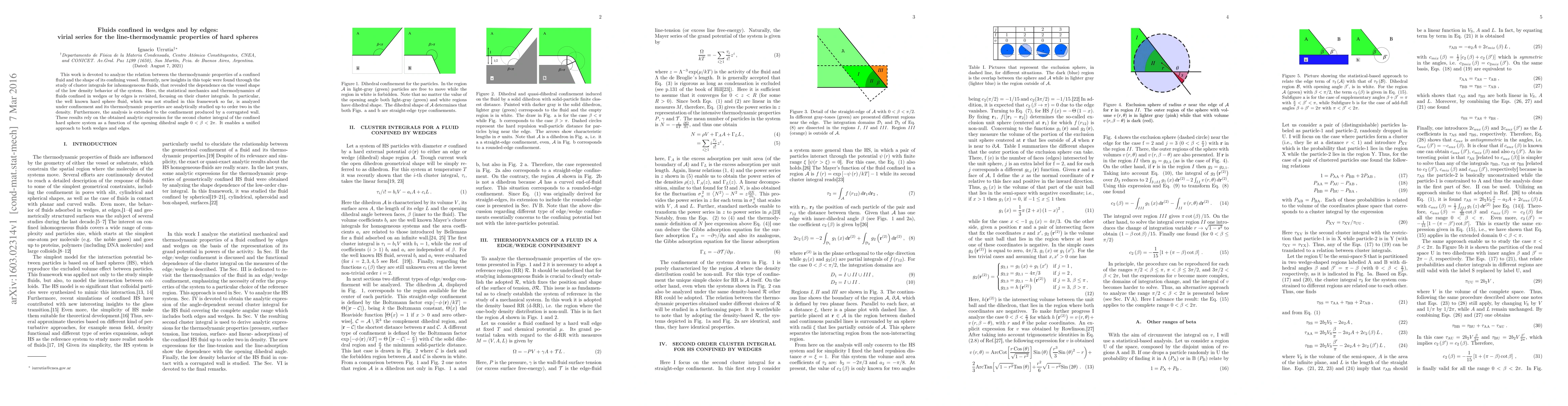 This paper analyzes the thermodynamic properties of hard sphere fluids confined in wedges or by edges, deriving a virial series for their line-thermodynamic properties. It focuses on the second cluster integral and extends the analysis to corrugated wall confinement, providing a unified approach to both wedges and edges.