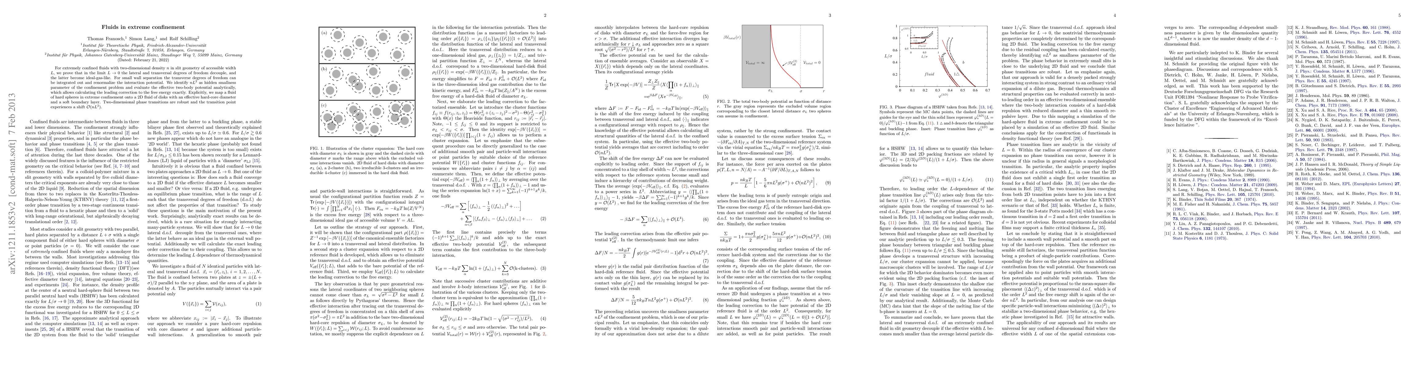 For extremely confined fluids with two-dimensional density $n$ in slit geometry of accessible width $L$, we prove that in the limit $L\to 0$ the lateral and transversal degrees of freedom decouple, and the latter become ideal-gas-like. For small wall separation the transverse degrees of freedom can be integrated out and renormalize the interaction potential. We identify $n L^2 $ as hidden smallness parameter of the confinement problem and evaluate the effective two-body potential analytically, which allows calculating the leading correction to the free energy exactly. Explicitly, we map a fluid of hard spheres in extreme confinement onto a 2d-fluid of disks with an effective hard-core diameter and a soft boundary layer. Two-dimensional phase transitions are robust and the transition point experiences a shift ${\cal O}(n L^2)$.