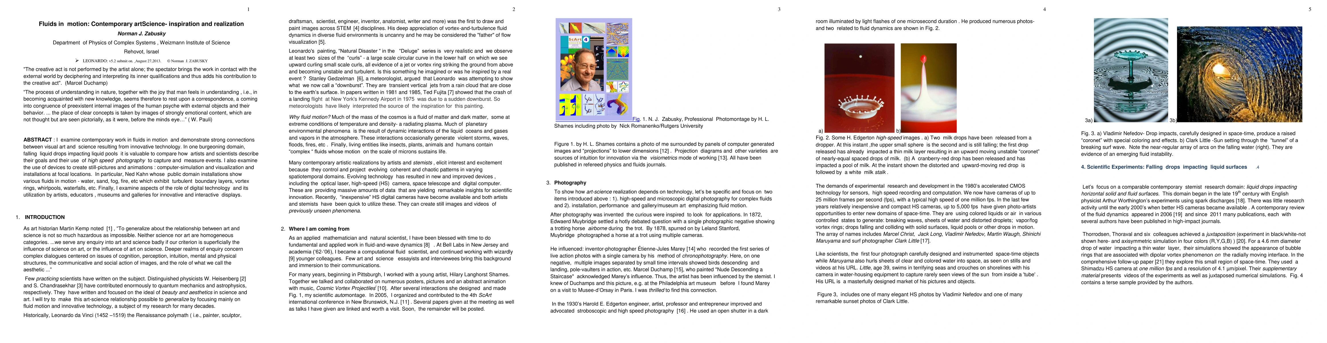 This paper explores the interplay between contemporary art, science, and technology, focusing on the study of fluids in motion, particularly falling liquid drops. It highlights how artists and scientists utilize high-speed digital photography and installations to capture and interpret fluid dynamics, with a focus on Ned Kahn's public installations and the role of digital technology in modern art displays.