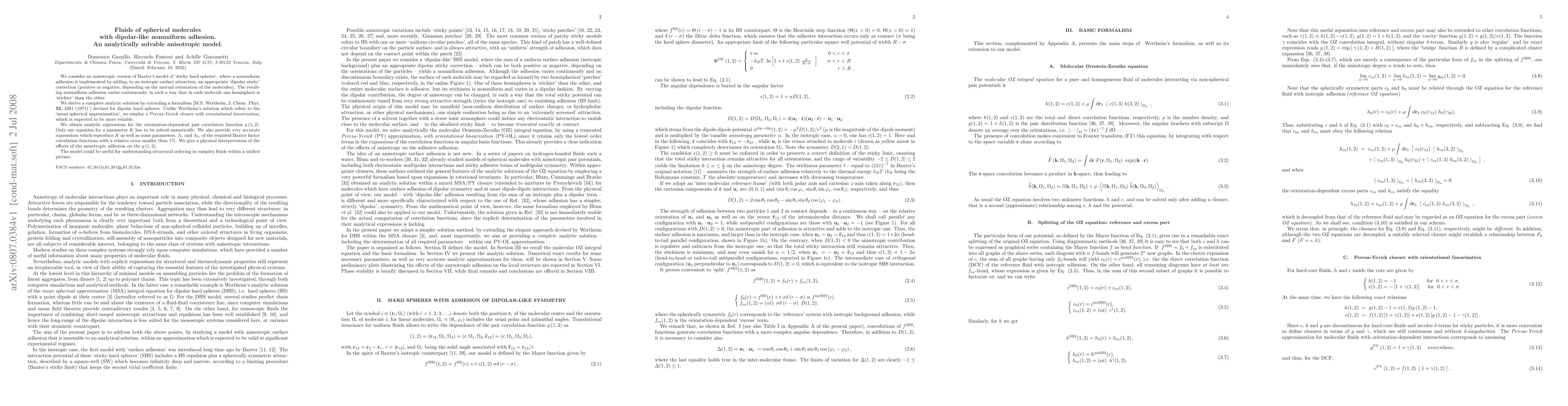 This paper presents an analytically solvable anisotropic model for fluids of spherical molecules with dipolar-like nonuniform adhesion. It extends Wertheim's formalism using a Percus-Yevick closure for more reliable results, providing accurate expressions for the orientation-dependent pair correlation function and potential applications in understanding structural ordering in complex fluids.