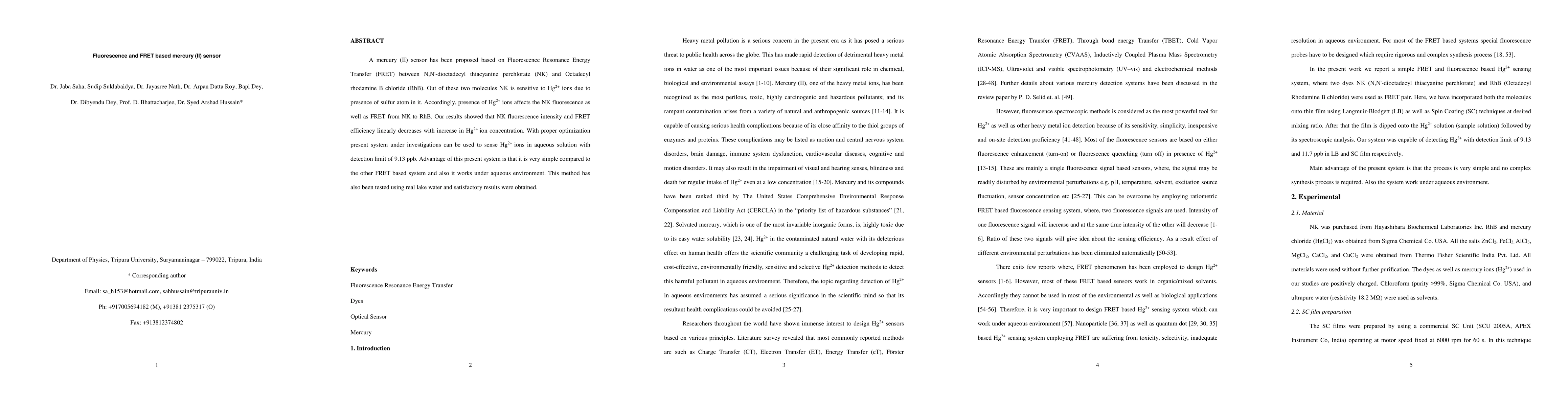 A mercury (II) sensor has been proposed based on Fluorescence Resonance Energy Transfer (FRET) between N,N'-dioctadecyl thiacyanine perchlorate (NK) and Octadecyl rhodamine B chloride (RhB). Out of these two molecules NK is sensitive to Hg2+ ions due to presence of sulfur atom in it. Accordingly, presence of Hg2+ ions affects the NK fluorescence as well as FRET from NK to RhB. Our results showed that NK fluorescence intensity and FRET efficiency linearly decreases with increase in Hg2+ ion concentration. With proper optimization present system under investigations can be used to sense Hg2+ ions in aqueous solution with detection limit of 9.13 ppb. Advantage of this present system is that it is very simple compared to the other FRET based system and also it works under aqueous environment. This method has also been tested using real lake water and satisfactory results were obtained.