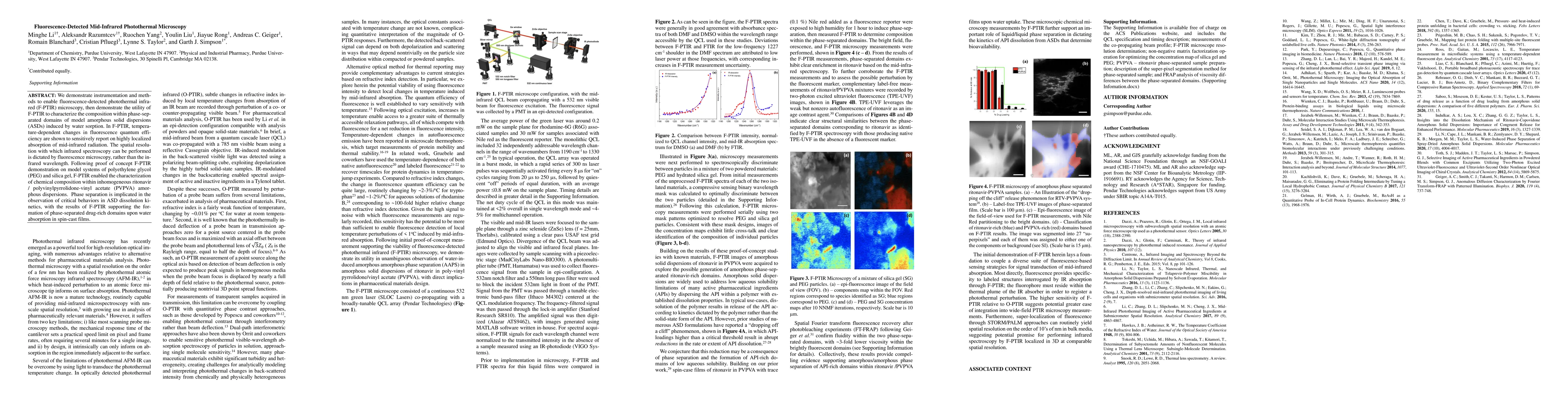 This paper introduces fluorescence-detected photothermal infrared (F-PTIR) microscopy, demonstrating its ability to characterize the composition of amorphous solid dispersions (ASDs) through phase-separated domains. The technique shows high spatial resolution and reveals phase-separated drug-rich domains in ritonavir/PVPVA dispersions upon water absorption.
