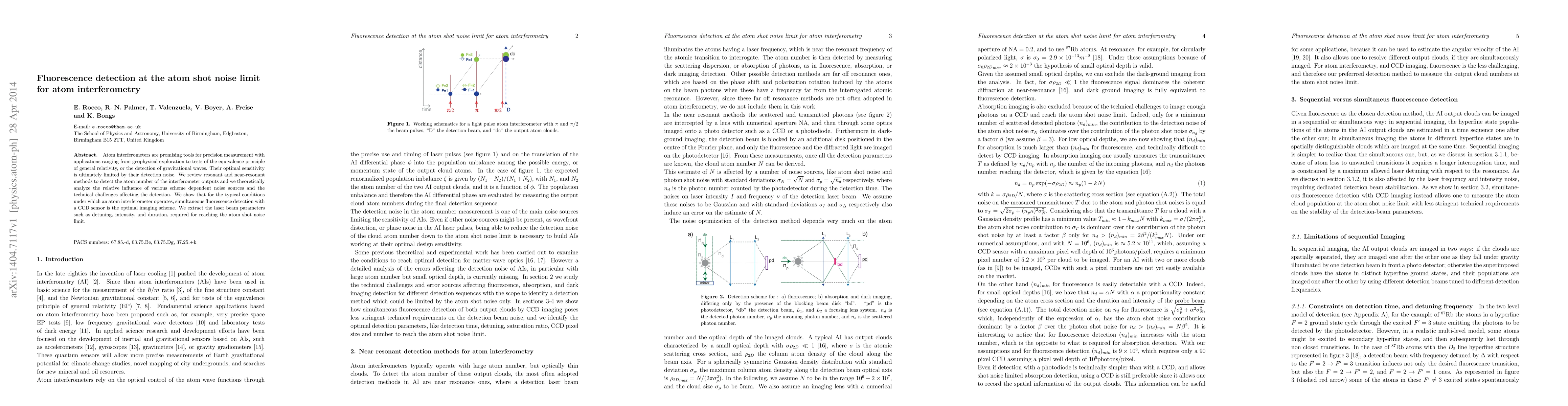 This paper reviews atom interferometry techniques and identifies simultaneous fluorescence detection using a CCD sensor as the optimal method for achieving the atom shot noise limit. It analyzes the influence of various noise sources and technical challenges, and determines the laser parameters needed for optimal sensitivity.