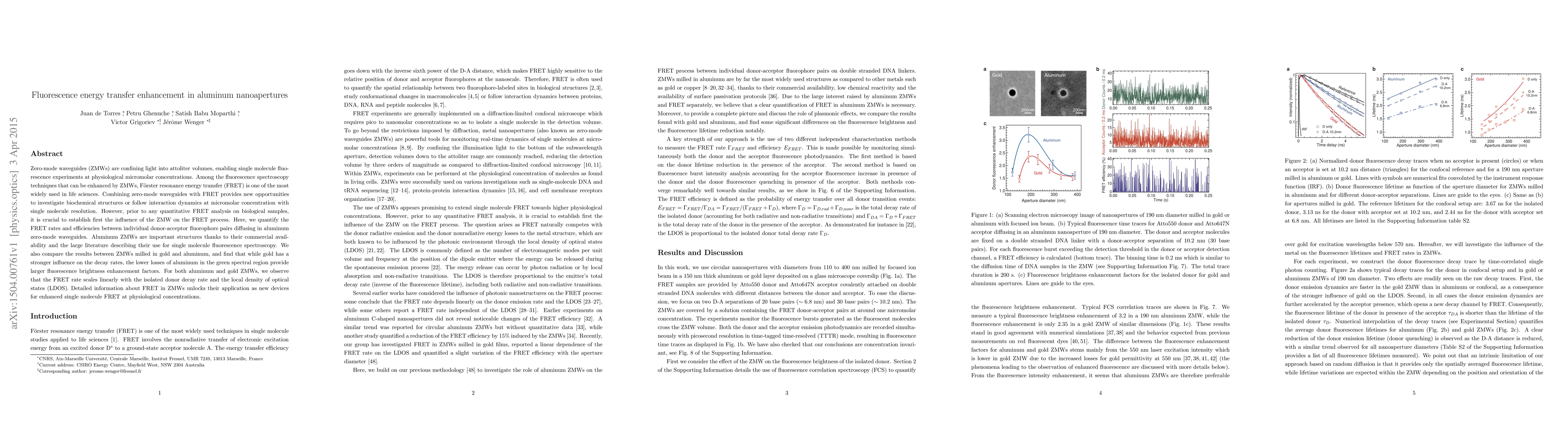 This paper investigates the enhancement of Förster resonance energy transfer (FRET) in zero-mode waveguides (ZMWs) made from aluminum and gold, demonstrating that aluminum ZMWs provide larger fluorescence brightness enhancements due to lower losses in the green spectral region, despite gold having a stronger influence on decay rates. The study reveals that FRET rates scale linearly with donor decay rates and local density of optical states.