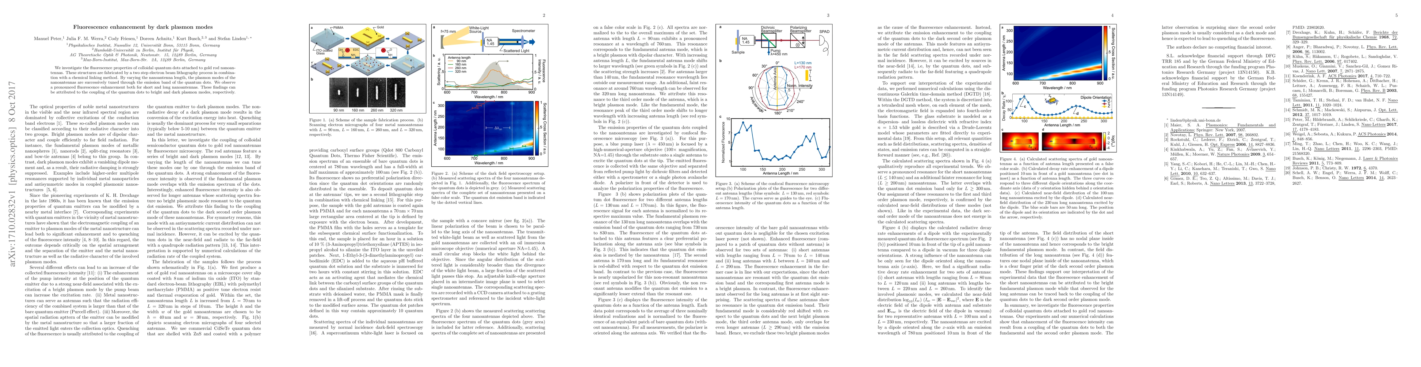 We investigate the fluorescence properties of colloidal quantum dots attached to gold rod nanoantennas. These structures are fabricated by a two step electron beam lithography process in combination with a chemical linking method. By varying the nanoantenna length, the plasmon modes of the nanoantennas are successively tuned through the emission band of the quantum dots. We observe a pronounced fluorescence enhancement both for short and long nanoantennas. These findings can be attributed to the coupling of the quantum dots to bright and dark plasmon modes, respectively.