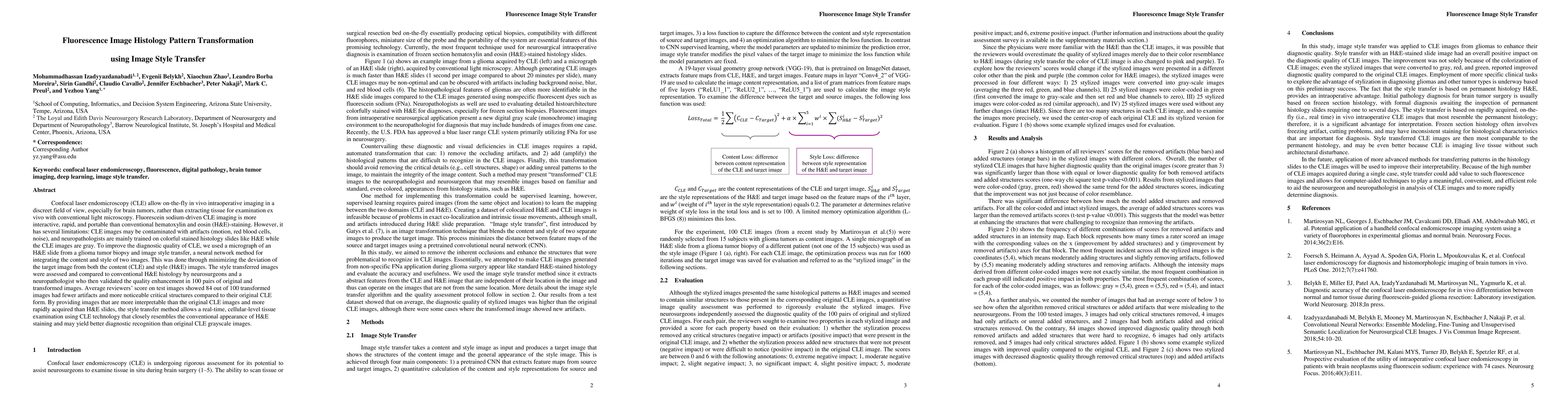 This study uses image style transfer to enhance the diagnostic quality of confocal laser endomicroscopy (CLE) images by integrating them with the appearance of hematoxylin and eosin (H&E)-stained histology slides. The transformed images showed fewer artifacts and more critical structures, leading to better diagnostic recognition compared to original CLE images.