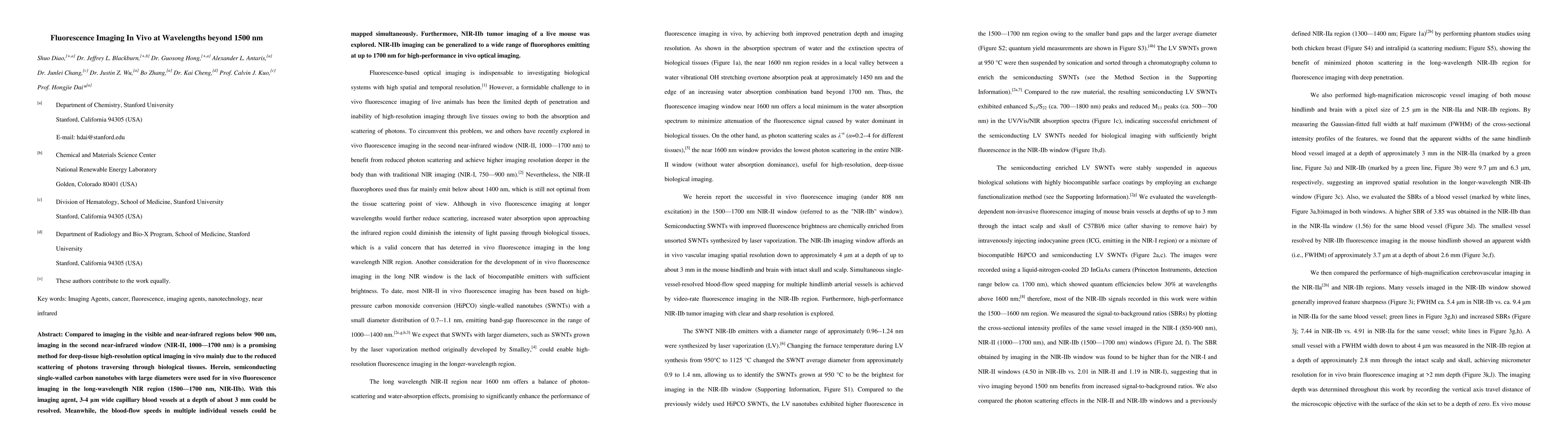 This paper explores the use of semiconducting single-walled carbon nanotubes for high-resolution in vivo fluorescence imaging in the NIR-IIb window (1500-1700 nm), achieving deep-tissue visualization of capillary blood vessels and simultaneous mapping of blood flow speeds. The technique also demonstrates potential for tumor imaging in live mice.